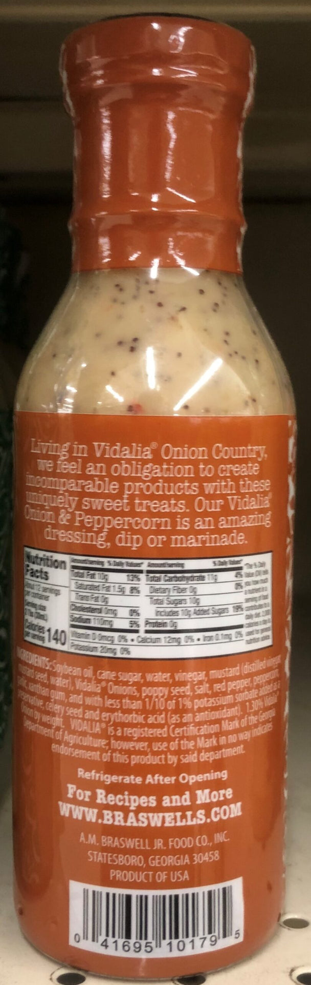 Braswell's Vidalia Onion and Peppercorn Dressing is a gourmet spread for your sandwiches and hamburgers. It also makes a delicious dip for vegetables, or a tasty marinade for meat, fish and poultry. The recipe is cholesterol-free. This 12-oz Braswell's dressing comes in a convenient pack of 6.