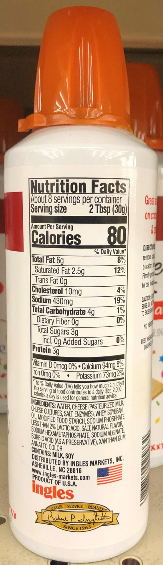 Add pizzazz to meals and snacks with Laura Lynn Cheese Snack Cheese Spray. Available in an Sharp Cheddar cheese flavor, this pasteurized process cheese product is made with real cheese and is easy to use. Simply remove the cap, hold the applicator tip close to your food, press the tip firmly, and move slowly across the food's surface. You can add it to crackers, tortilla chips, or even steak sandwiches to create your own Philly cheese steak at home. It's delicious on both soft and hard pretzels, added to a sandwich, served atop a hot dog, or used over other foods as a rich and creamy addition. With seven servings per container, three grams of protein, and zero trans fats, you'll want to keep Laura Lynn Cheese Snack Cheese Spray on hand to kick your meals and snacks up a notch.