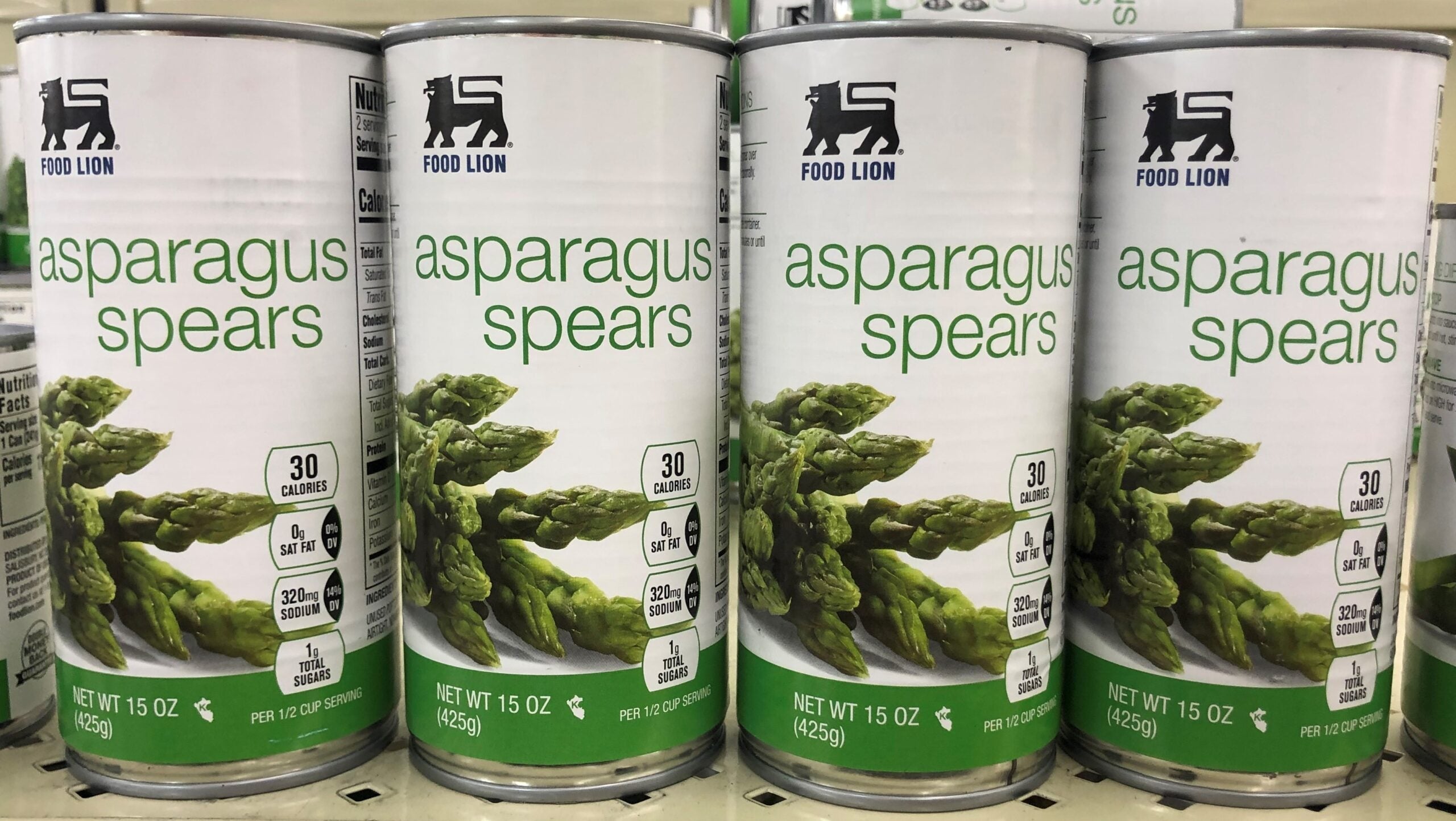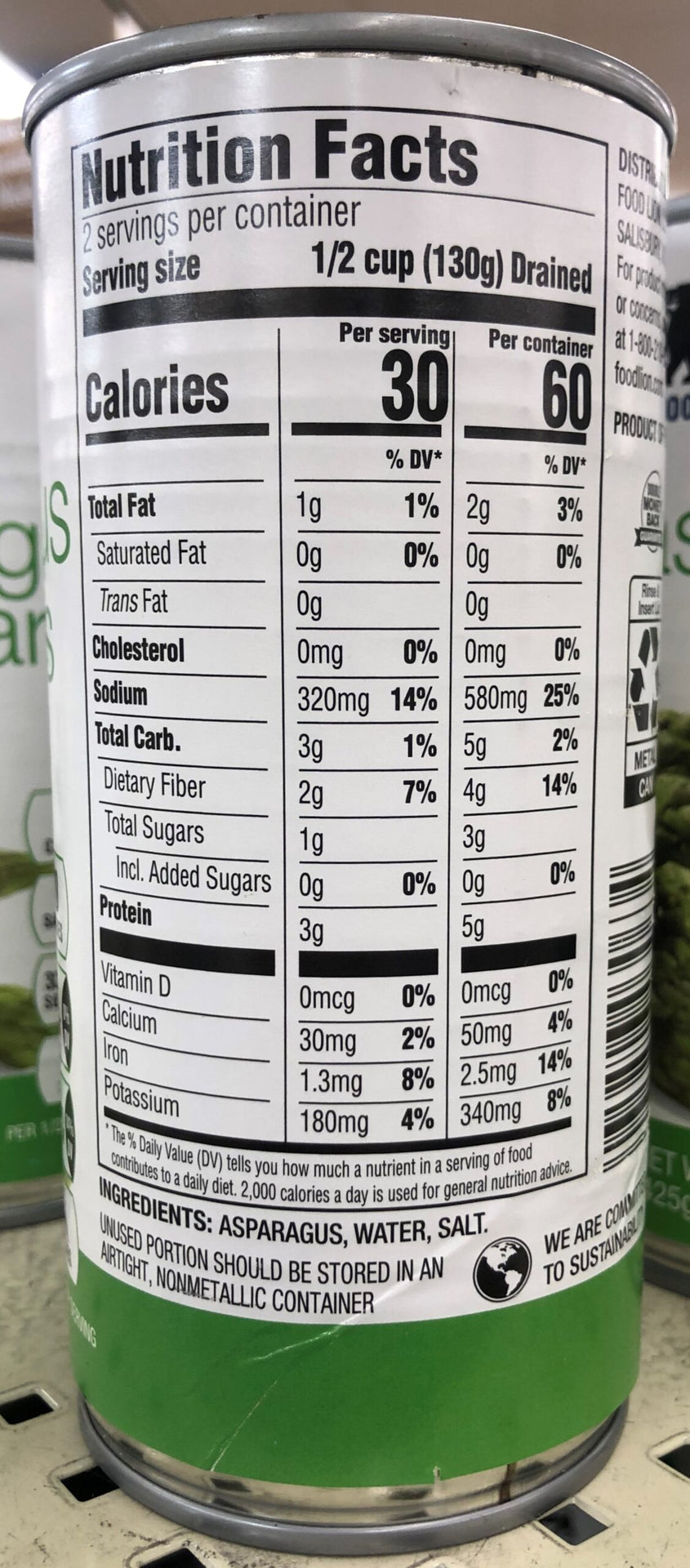 Food Lion Asparagus Spears, Can Per 1/2 Cup: 30 calories; 0 g sat fat (0% DV); 320 mg sodium (14% DV); 1 g total sugars.