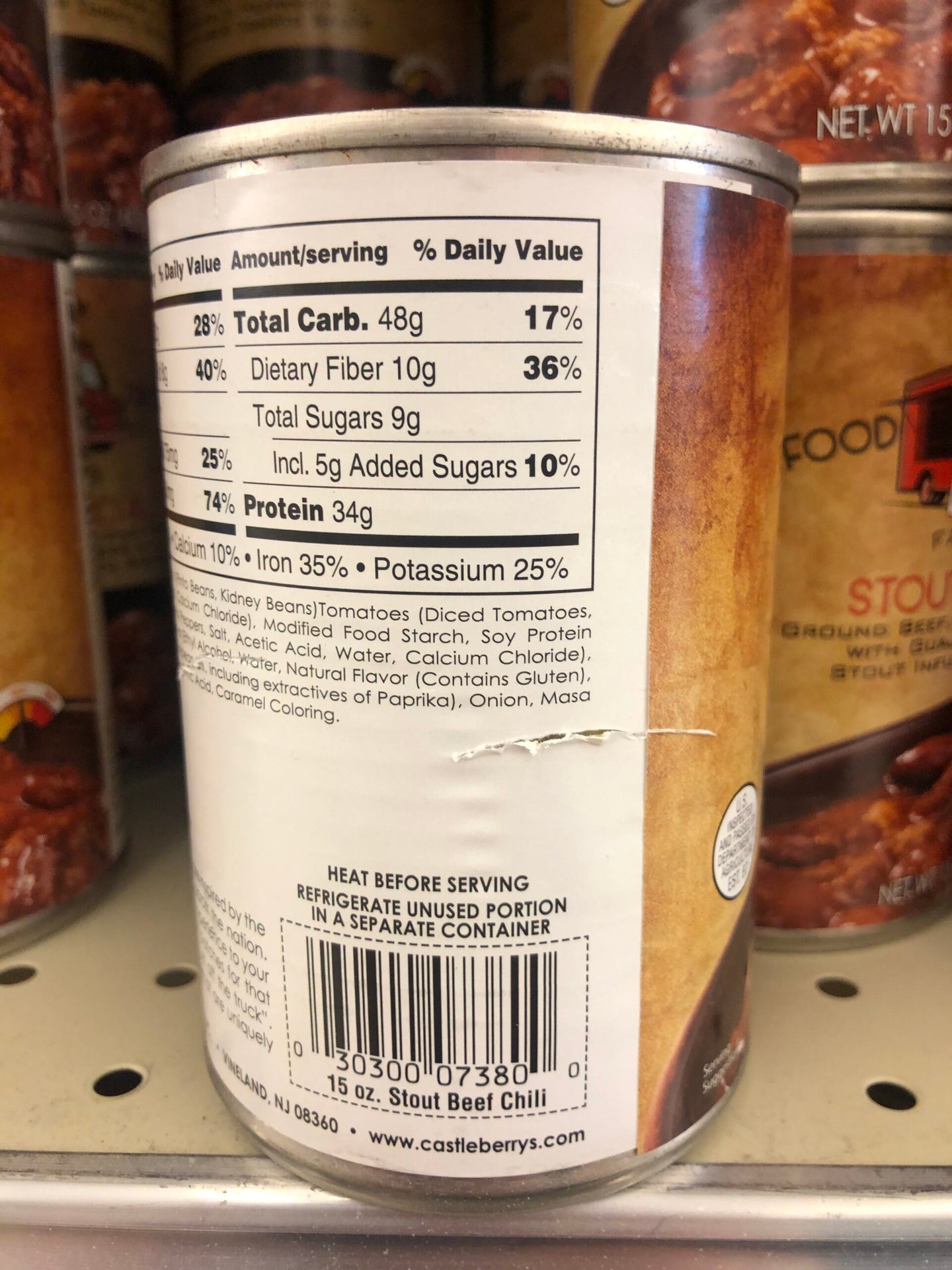 Water, beef, prepared beans(pinto, kidney), tomatoes(dices tomatoes, tomato paste, tomato juice, citric acid, calcium chloride), modified food starch, soy protein concentrate, jalapeno peppers(jalapeno peppers, salt, acetic acid, water, calcium chloride),sugar, guajillo chili pepper, stout beer flavor[ethyl alcohol, water, natural flavor(contains gluten), and stout beer], sea salt, natural flavor(soybean oil, including extractives of paprika), onion, masa harina, green bell pepper, red bell pepper, citric acid, caramel coloring.