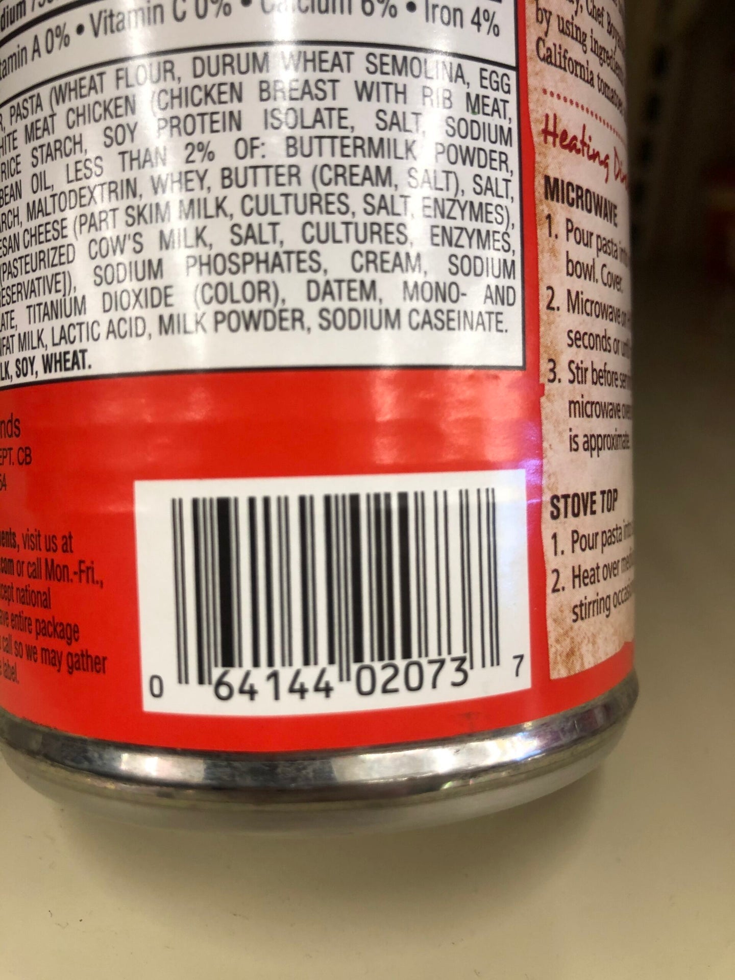 Ingredients: Water, Pasta (Wheat Flour, Durum Wheat Semolina, Egg White), Cooked White Meat Chicken (Chicken Breast with Rib Meat, Water, Modified Rice Starch, Soy Protein Isolate, Salt, Sodium Phosphates), Soybean Oil, LESS THAN 2% OF: Buttermilk Powder, Modified Corn Starch, Maltodextrin, Whey, Butter (Cream, Salt), Salt, Flavorings, Parmesan Cheese (Part Skim Milk, Cultures, Salt, Enzymes), Romano Cheese (Pasteurized Cow's Milk, Salt, Cultures, Enzymes, Sorbic Acid [Preservative]), Sodium Phosphates, Cream, Sodium Stearoyl Lactylate, Titanium Dioxide (Color), DATEM, Mono- and Diglycerides, Nonfat Milk, Lactic Acid, Milk Powder, Sodium Caseinate. CONTAINS: EGG, MILK, SOY, WHEAT