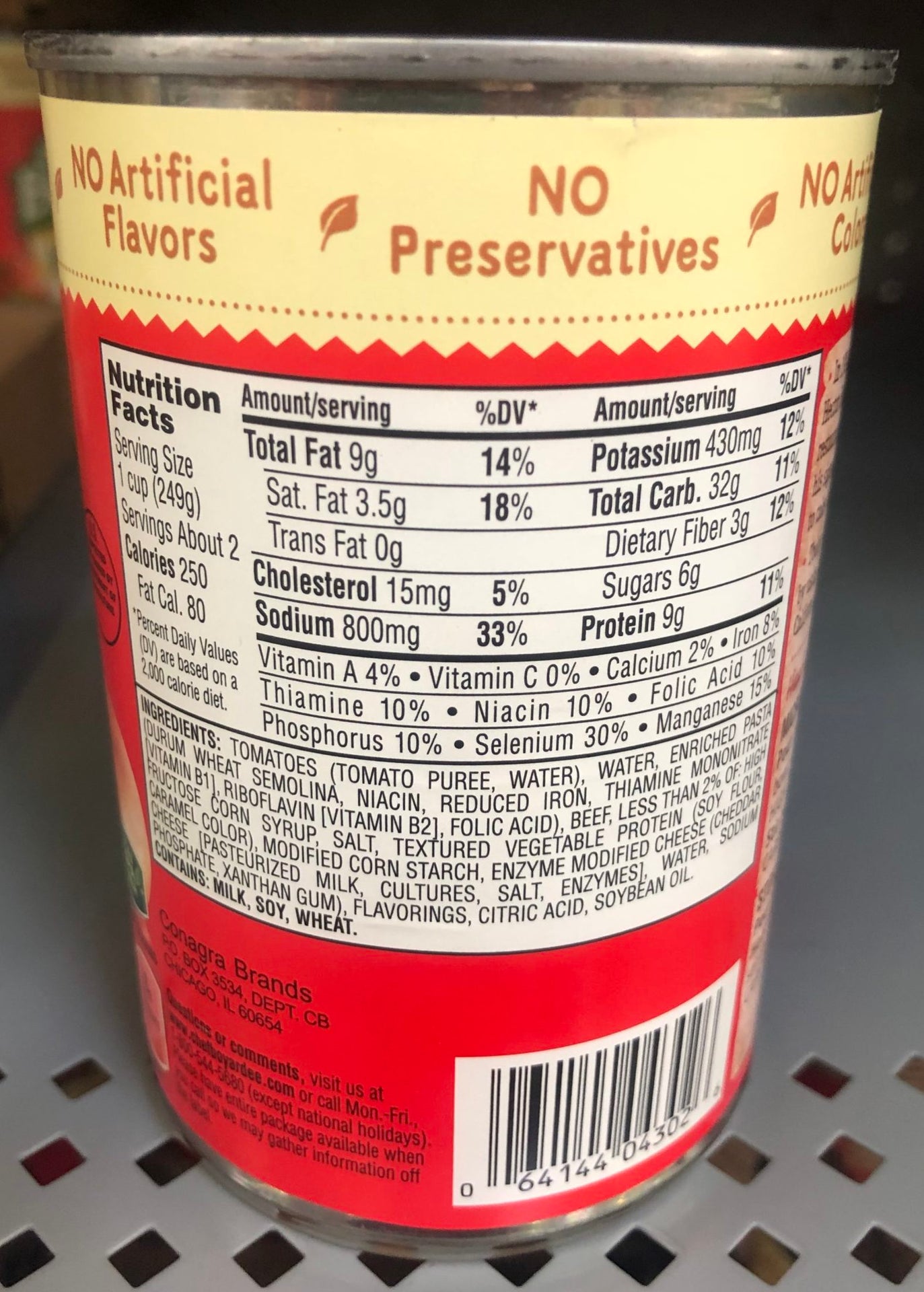 Ingredients: Tomatoes (Tomato Puree, Water), Water, Enriched Pasta (Durum Wheat Semolina, Niacin, Reduced Iron, Thiamine Mononitrate [Vitamin B1], Riboflavin [Vitamin B2], Folic Acid), Beef, LESS THAN 2% OF: High Fructose Corn Syrup, Salt, Textured Vegetable Protein (Soy Flour, Caramel Color), Modified Corn Starch, Enzyme Modified Cheese (Cheddar Cheese [Pasteurized Milk, Cultures, Salt, Enzymes], Water, Sodium Phosphate, Xanthan Gum), Flavorings, Citric Acid, Soybean Oil. CONTAINS: MILK, SOY, WHEAT