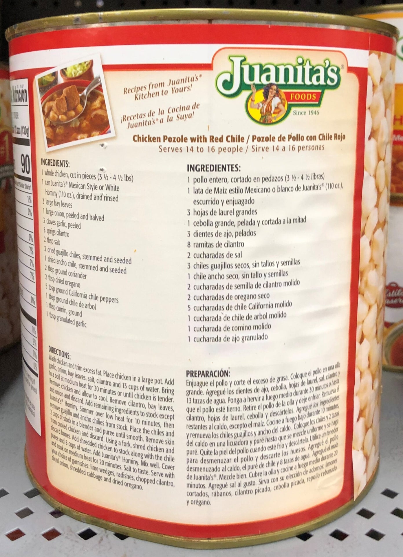 Juanita's Foods Mexican-Style Hominy has had authentic ingredients and flavor since 1946. It comes in a 2.97 kg can. Juanita's Mexican-style hominy is a good source of fiber and does not contain any cholesterol. It's also free of preservatives, and the can is used without a BPA lining. The hominy is gluten-free, which makes it a good option for those with certain dietary restrictions. It can be used in a variety of dishes, such as chicken pozole with red chili. A delicious recipe for this meal can be found on the back of Juanita's hominy can.