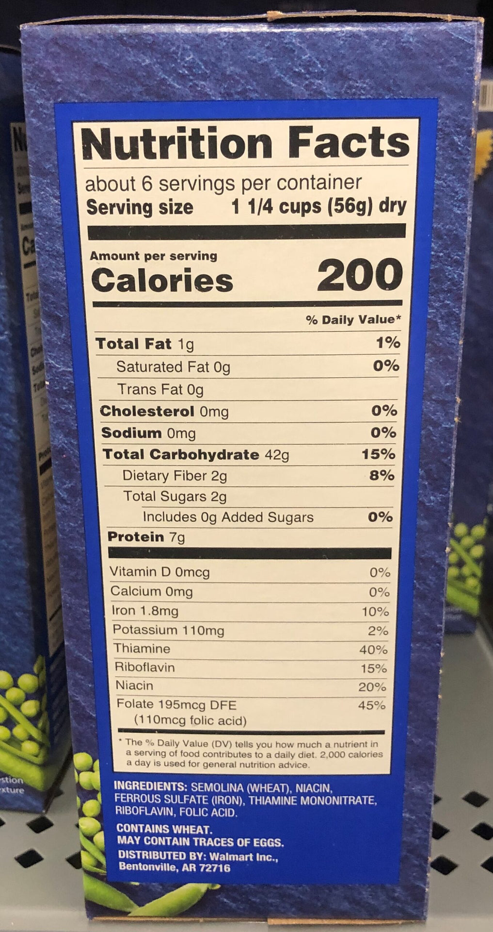 Ingredients: SEMOLINA (WHEAT), DURUM FLOUR (WHEAT), NIACIN, FERROUS SULFATE (IRON), THIAMIN MONONITRATE, RIBOFLAVIN, FOLIC ACID