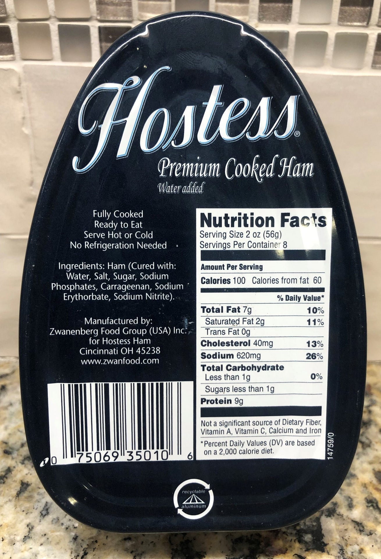 Ham (Cured with: Water, Salt, Sugar, Sodium Phosphates, Carrageenan, Sodium Erythorbate, Sodium Nitrite).