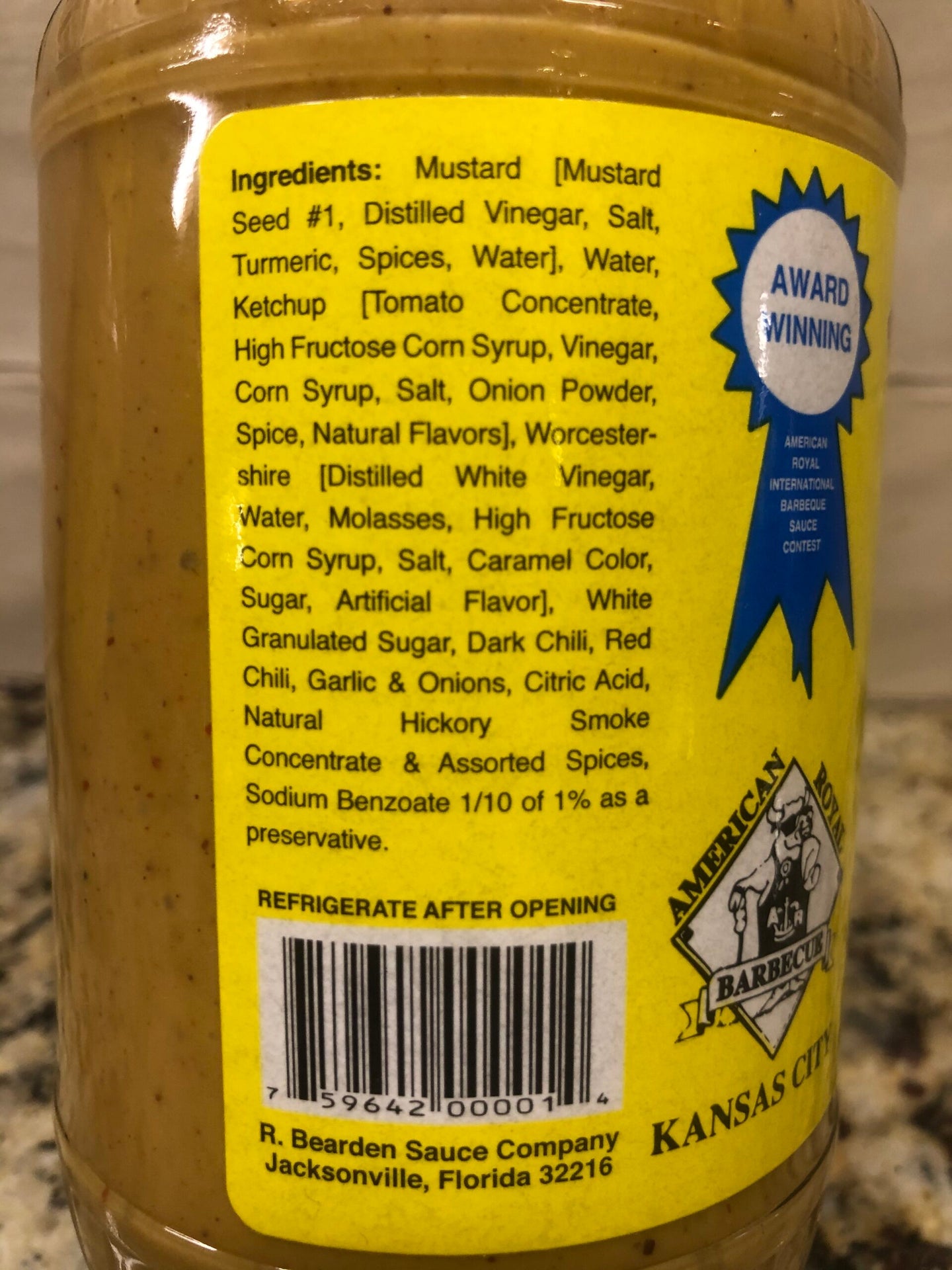 Ingredients:Mustard [Mustard Seed 1, Distilled Vinegar, Salt, Turmeric, Spices, Water], Water, Ketchup [Tomato Concentrate, High Fructose Corn Syrup, Vinegar, Corn Syrup, Salt, Onion Powder, Spice, Natural Flavors], Worcestershire [Water, Salt, Vinegar, Caramel Color, Citric Acid, Propylene Glycol, Hydrolyzed Vegetable Protein, Garlic Powder, Potassium Sorbate (as Preservative), Xanthan Gum, Natural and Artificial Flavor and Capsium], 50 Grain Distilled White Vinegar, White Granulated Sugar, Dark Chili, Red Chili, Garlic & Onions, Citric Acid, Natural Hickory Smoke Concentrate & Assorted Spices, Sodium Benzoate 1/10 of 1% as a Preservative.