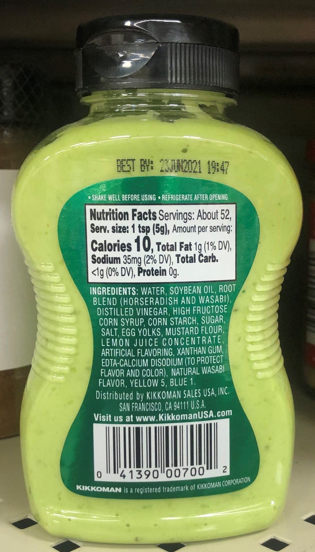 Ingredients: Water, Soybean Oil, Root Blend (Horseradish and Wasabi), Distilled Vinegar, High Fructose Corn Syrup, Corn Starch, Sugar, Salt, Egg Yolks, Mustard Flour, Lemon Juice Concentrate, Artificial Flavoring, Xanthan Gum, EDTA-Calcium Disodium (to Protect Flavor and Color), Natural Wasabi Flavor, Yellow 5, Blue 1.