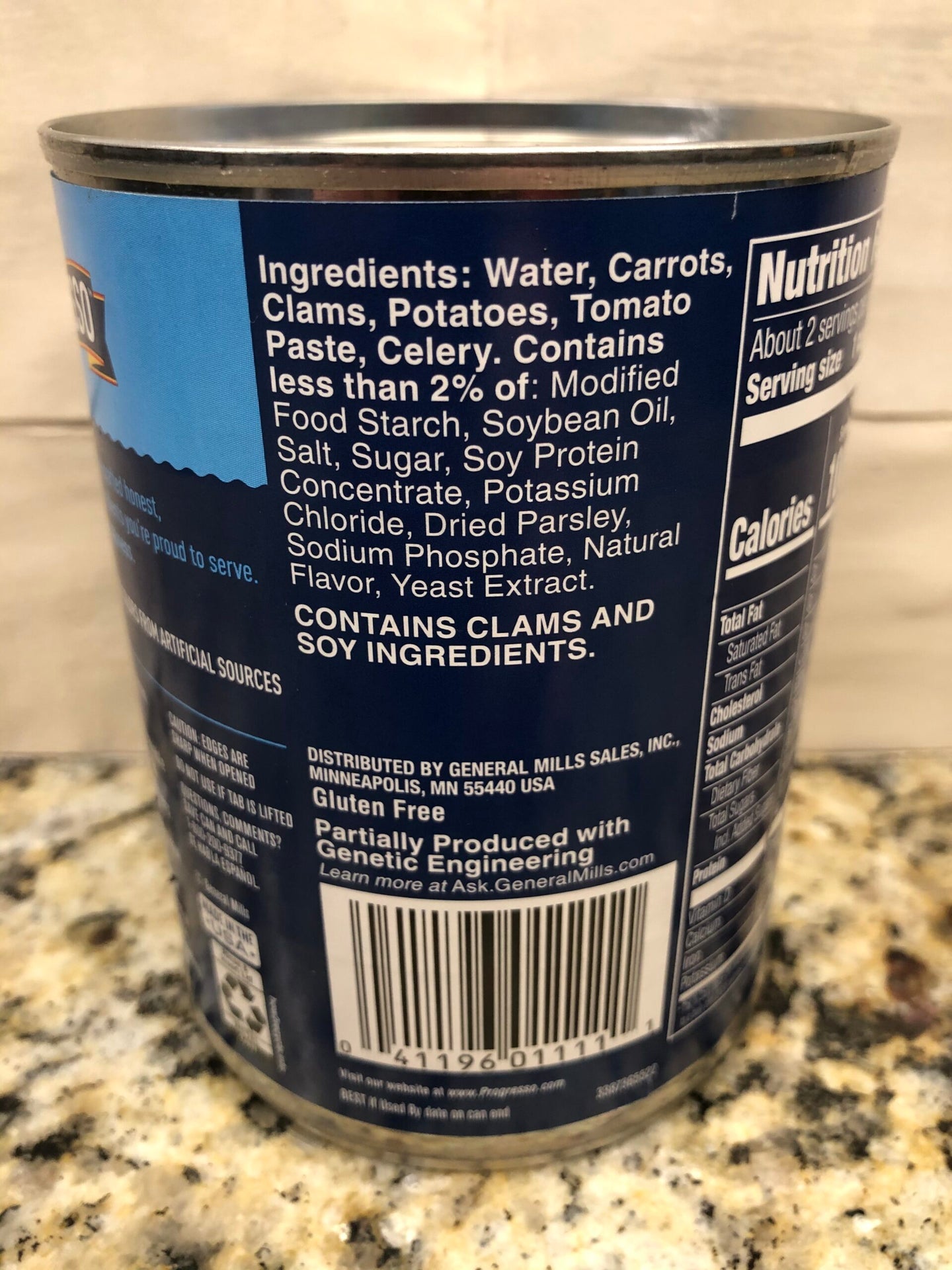 Ingredients: Water, Carrots, Clams, Potatoes, Tomato Paste, Celery, Contains Less than 2% of: Modified Food Starch, Soybean Oil, Salt, Sugar, Soy Protein Concentrate, Potassium Chloride, Dried Parsley, Sodium Phosphate, Natural Flavor, Yeast Extract.