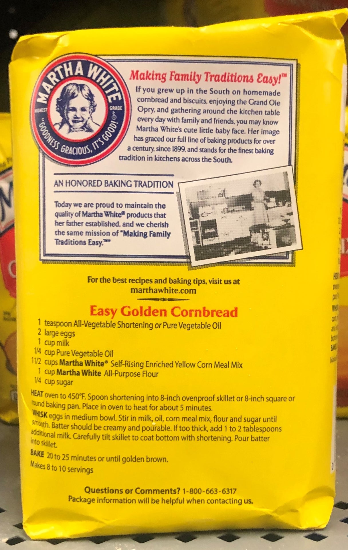 Corn Meal Mix, Self-Rising, Hot Rize, Yellow, Bag 2 LB Enriched. Making family traditions easy for over 100 years. Per 3 Tbsp: 110 calories; 0 g sat fat (0% DV); 460 mg sodium (19% DV); 0 g sugars. Highest grade. Goodness gracious, it's good! Making Family Traditions Easy: If you grew up in the South on homemade cornbread and biscuits, enjoying the Grand Ole Opry, and gathering around the kitchen table every day with family and friends, you may know Martha White's cute little baby face, Her image has graced our full line of baking products for over a century, since 1899, and stands for the finest baking tradition in kitchens across the South. An Honored Baking Tradition: Today we are proud to maintain the quality of Martha White products that her father established, and we cherish the same mission of making family traditions easy. For the best recipes and baking tips visit us at www.marthawhite.com. Questions or Comments? 1-800-663-6317 weekdays 9am to 7pm (EST). Package information will be helpful when contacting us. Contains wheat ingredients. May contain milk ingredients. 32 oz (2 lb) 907 g PO Box 751030 Memphis, TN 38175 800-663-6317Martha White Self-Rising Yellow Corn Meal Mix: