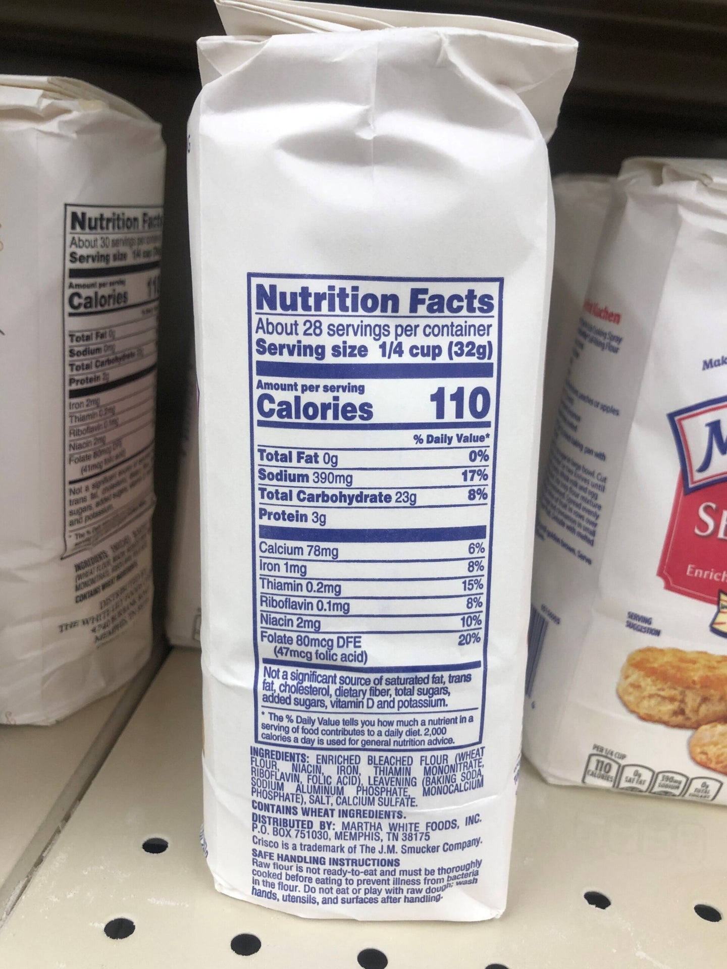 - Enriched. Bleached. Pre-sifted. Making family traditions easy for over 100 years. Per 1/4 Cup: 110 calories; 0 g sat fat (0% DV); 390 mg sodium (16% DV); 0 g sugars. Highest grade. Goodness gracious, it's good! Making Family Traditions Easy: If you grew up in the South on homemade cornbread and biscuits, enjoying the Grand Ole Opry, and gathering around the kitchen table every day with family and friends. you may know Martha White's cute little baby face. Her image has graced our full line of baking products for over a century, since 1899, and stands for the finest baking tradition in kitchens across the South. An Honored Baking Tradition: Today we are proud to maintain the quality of Martha White products that her father established, and we cherish the same mission of making family traditions easy.