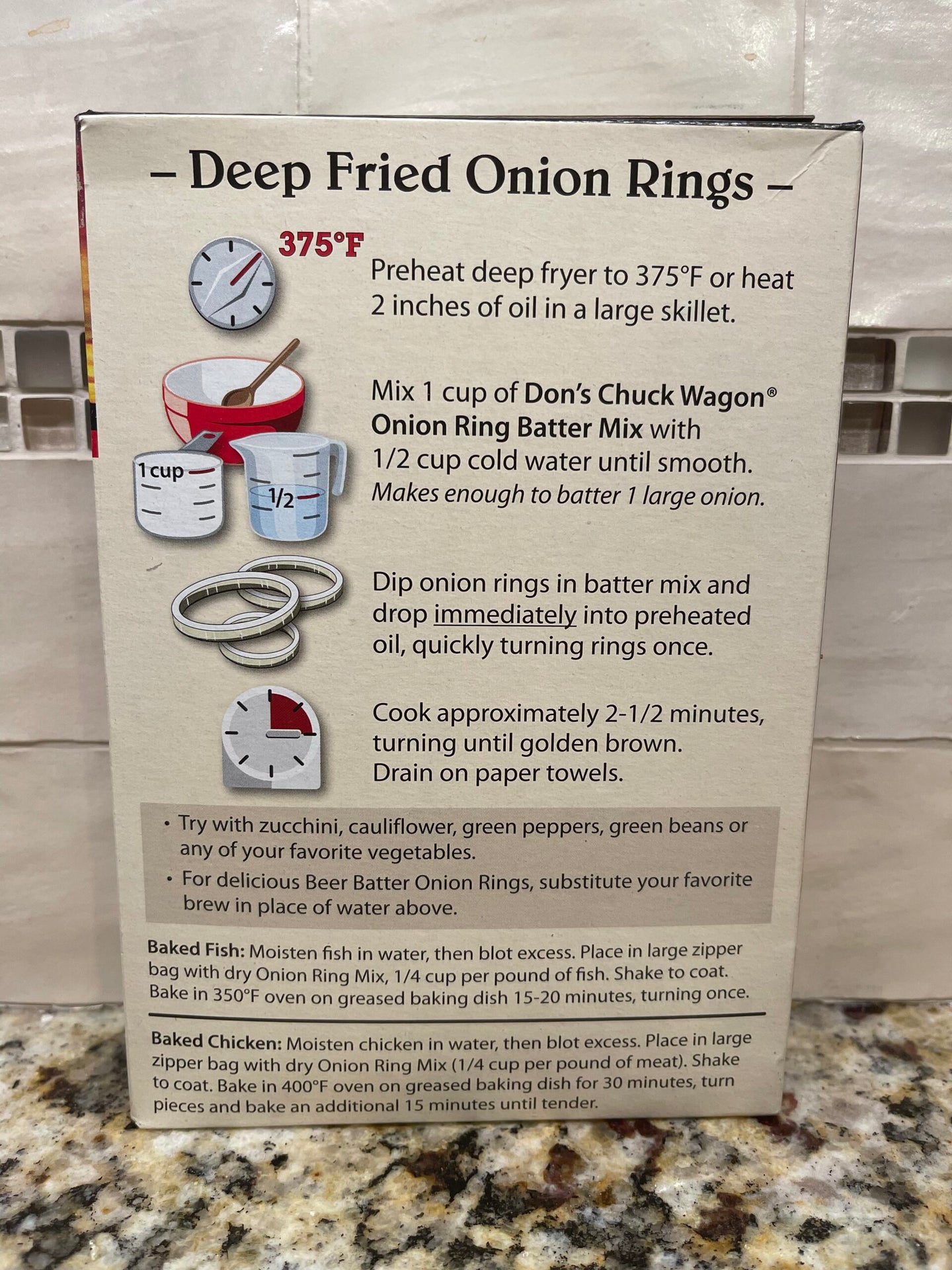 Enjoy a unique balance of flavor with the Don's Chuck Wagon Onion Ring Batter Mix. It offers a tasty coating for a side dish. The Don's Chuck Wagon batter mix is free of fat, cholesterol and preservatives.