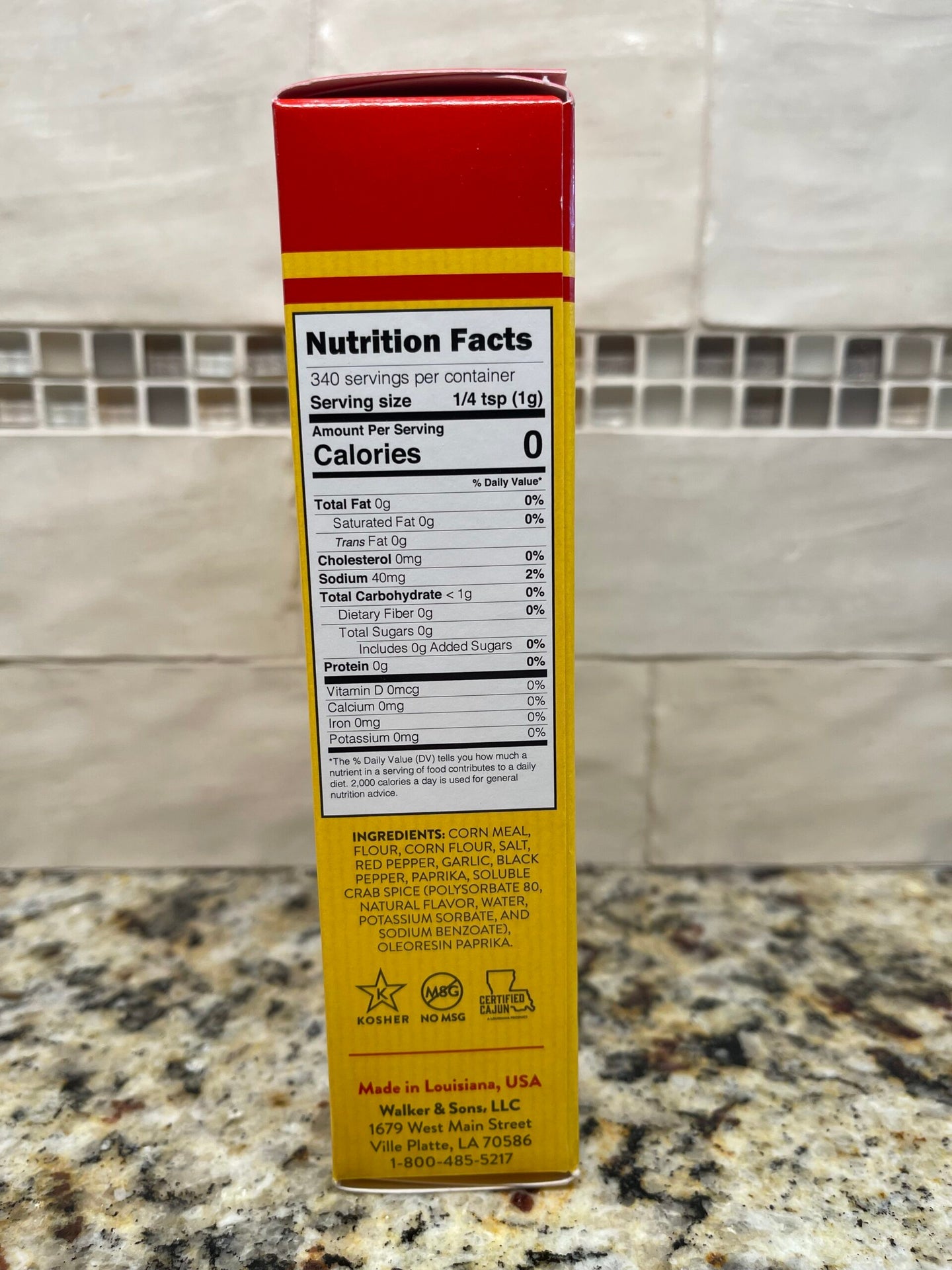 Ingredients: CORN MEAL, CORN FLOUR, FLOUR, SALT, RED PEPPER, GARLIC, BLACK PEPPER, PAPRIKA, SOLUBLE CRAB SPICE, OLEORESIN PAPRIKA.