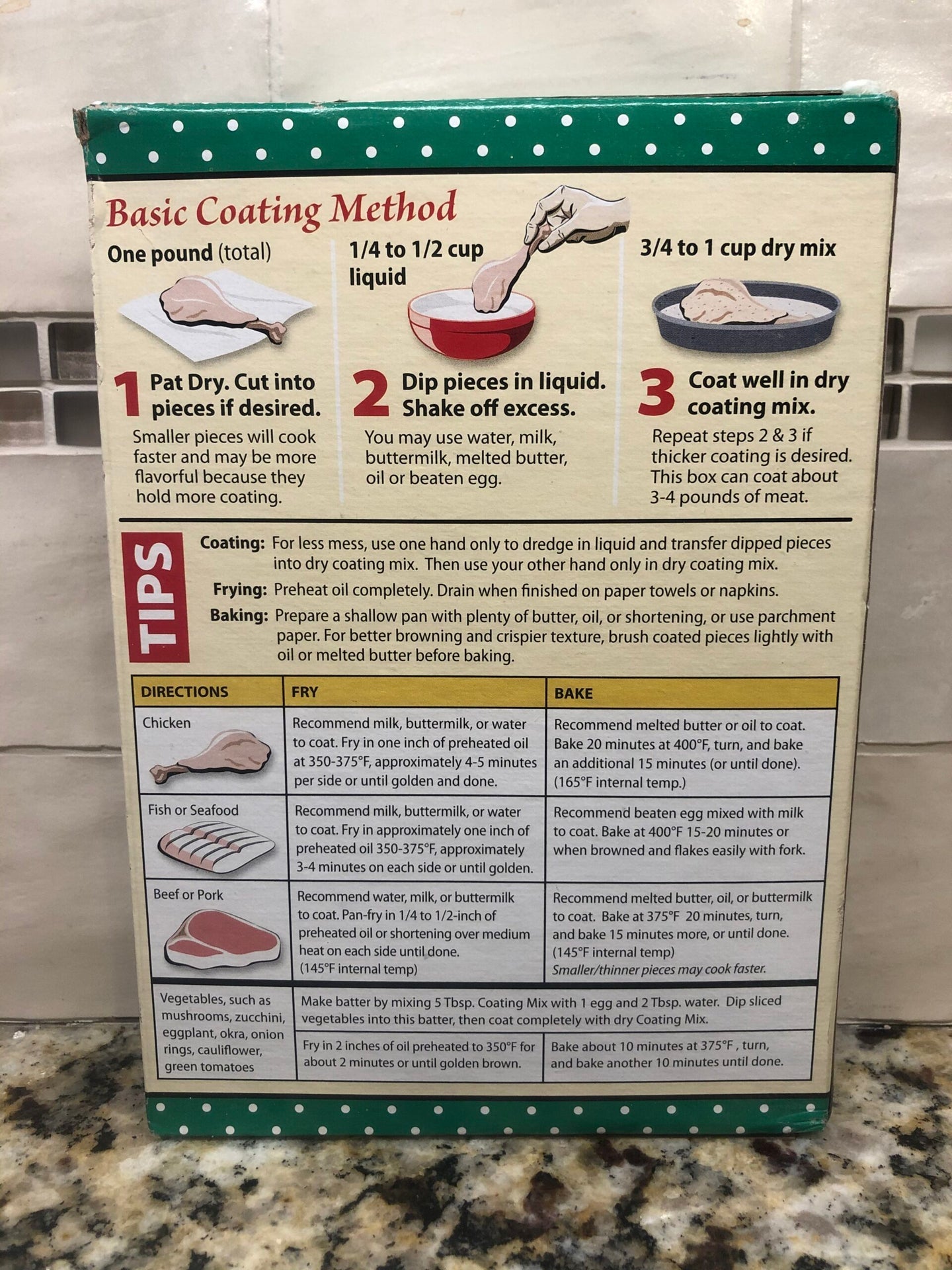 Instructions: Basic Coating Method: One pound (total). 1/4 to 1/2 cup liquid. 3/4 to 1 cup dry mix. 1. Pat dry. Cut into pieces if desired. Smaller pieces will cook faster and may be more flavorful because they hold more coating. 2. Dip pieces in liquid. Shake off excess. You may use water, milk, buttermilk, melted butter, oil or beaten egg. 3. Coat well in dry coating mix. Repeat steps 2 & 3 if thicker coating is desired. This box can coat about 3-4 pounds of meat. Tips: Coating: For less mess, use one hand only to dredge in liquid and transfer dipped pieces into dry coating mix. Then use your other hand only in dry coating mix. Frying: Preheat oil completely. Drain when finished on paper towels or napkins. Baking: Prepare a shallow pan with plenty of water, oil or shortening or use parchment paper. For better browning and crispier texture, brush coated pieces lightly with oil or melted butter before baking. Chicken: Fry: Recommended milk, buttermilk or water to coat. Fry in one inch of preheated oil at 350-375 degrees F, approximately 4-5 minutes per side or until golden and done. Bake: Recommend melted butter or oil to coat. Bake 20 minutes at 400 degrees F, turn and bake an additional 15 minutes (or until done) (165 degrees F internal temp). Fish or Seafood: Fry: Recommended milk, buttermilk or water to coat. Fry in one inch of preheated oil at 350-375 degrees F, approximately 3-4 minutes per side or until golden and done. Bake: Recommend beaten egg mixed with milk to coat. Bake at 400 degrees F 15-20 minutes or when browned and flakes easily with fork. Beef or Pork: Recommend water, milk or buttermilk to coat. Pan-fry in 1/4 to 1/2 inch of preheated oil or shortening over medium heat on each side until done (145 degrees F internal temp). Bake: Recommend melted butter, oil or buttermilk to coat. Bake at 375 degrees F 20 minutes, turn and bake 15 minutes more, or until done (145 degrees F internal temp). Smaller/thinner pieces may cook faster. Vegetables such as mushrooms, zucchini, eggplant, okra, onion rings, cauliflower, green tomatoes: Fry: Make batter by mixing 5 tbsp coating mix with 1 egg and 2 tbsp water. Dip sliced vegetables into this batter, then coat completely with dry coating mix. Fry in 2 inches of oil preheated to 350 degrees F for about 2 minutes or until golden brown. Bake: Bake about 10 minutes at 375 degrees F, turn and bake another 10 minutes until done.