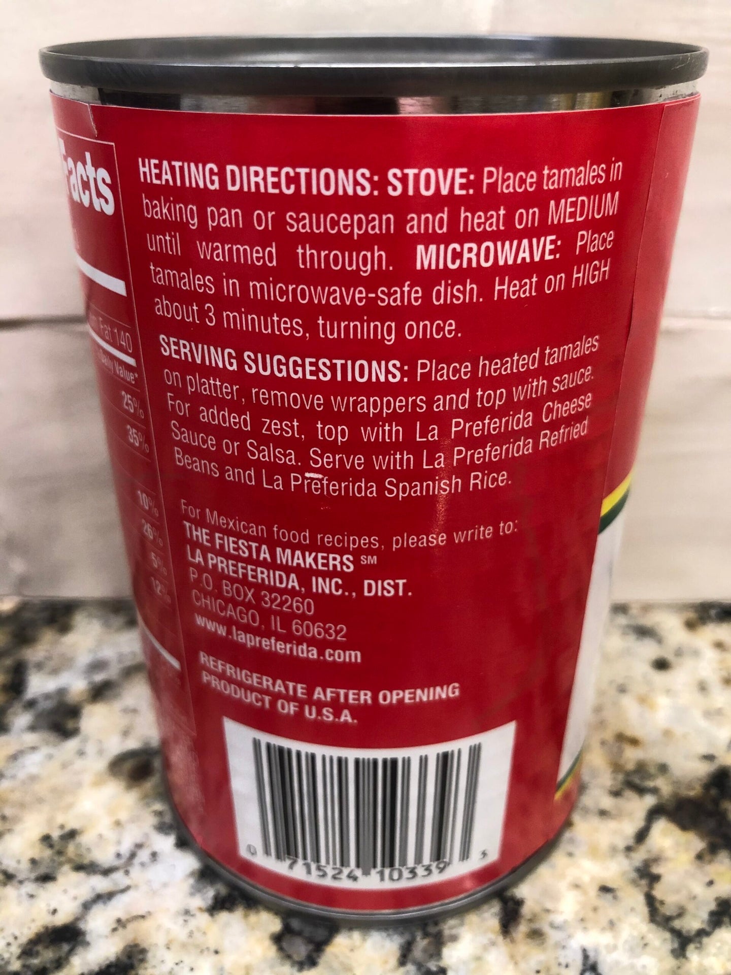 Instructions: Refrigerate after opening.Heating Directions:Stove: Place tamales in baking pan or saucepan and heat on medium until warmed through.Microwave: Place tamales in microwave-safe dish. Heat on high about 3 minutes, turning once.Serving Suggestions: Place heated tamales on platter, remove wrappers and top with sauce. For added zest, top with La Preferida Cheese Sauce or Salsa. Serve with La Preferida Refried Beans and La Preferida Spanish Rice.