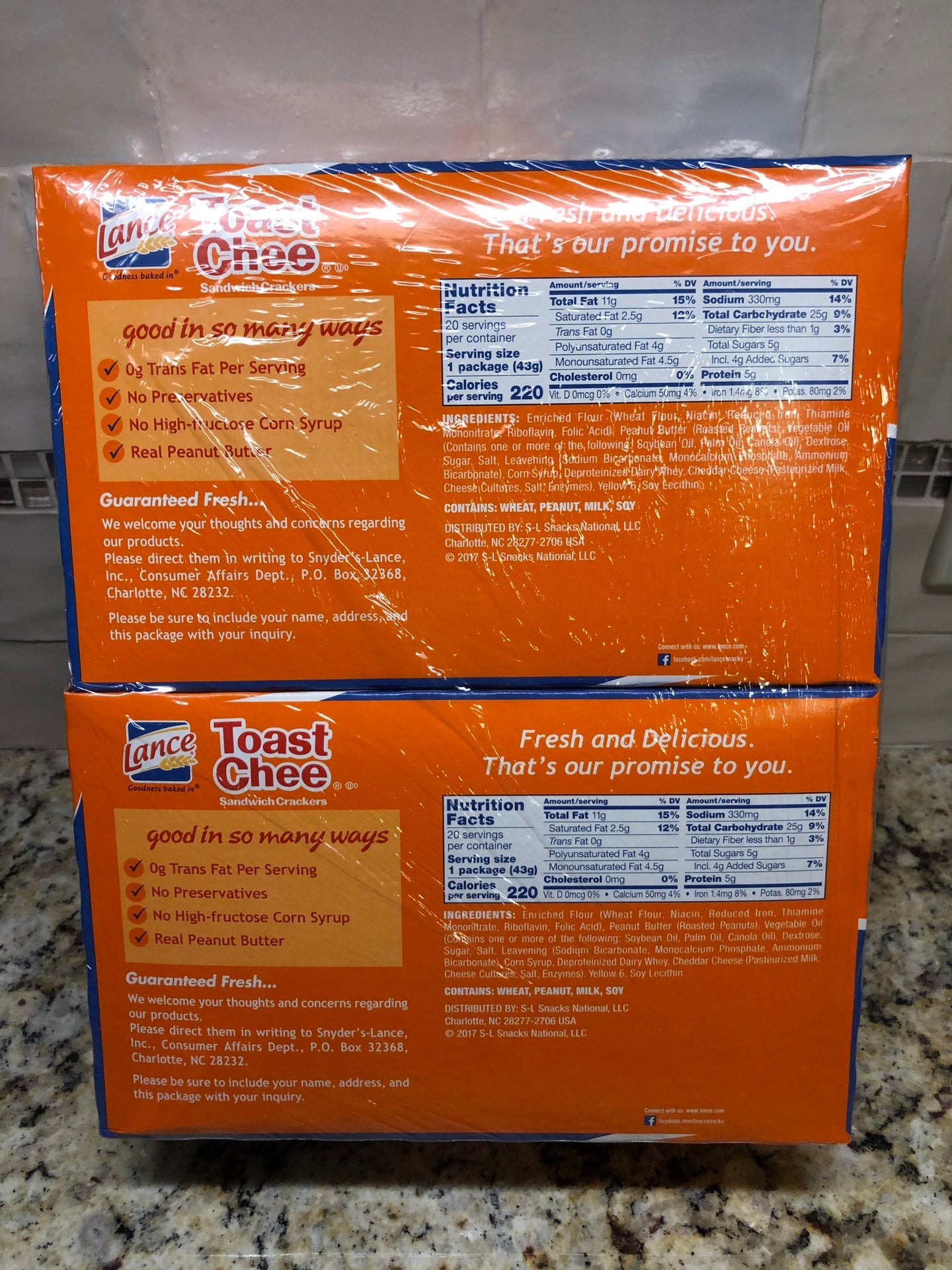 For a great snack, grab a Toastchee. Great cheese crackers with peanut butter. You get 40 (6 packs) of this treat.