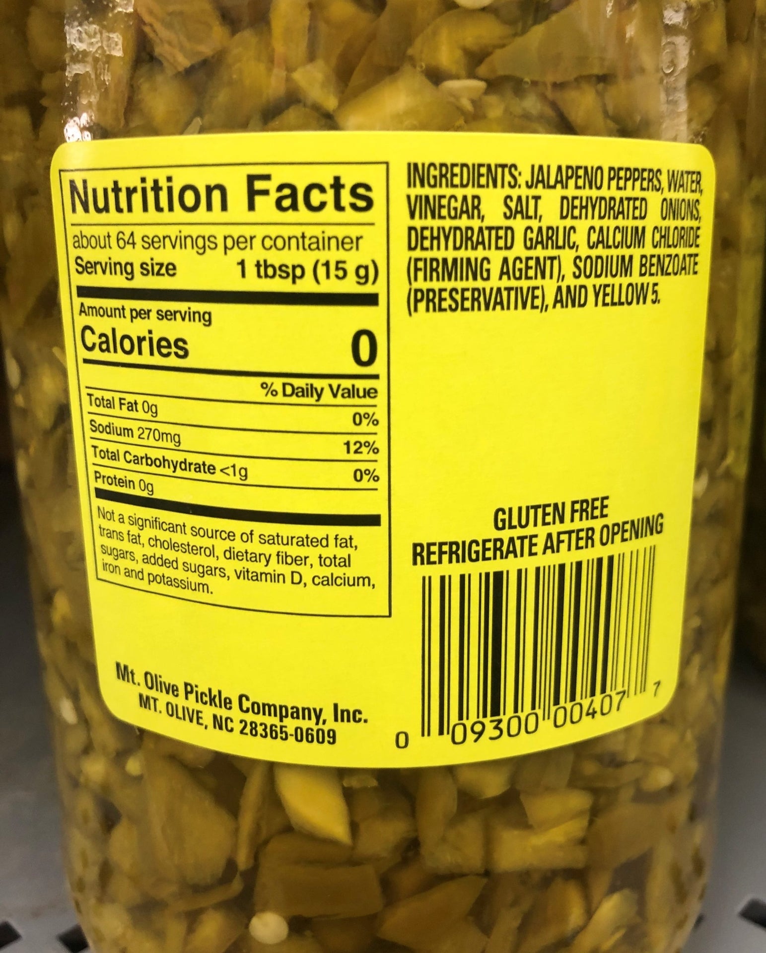 Ingredients: JALAPENO PEPPERS, WATER, VINEGAR, SALT, DEHYDRATED ONIONS, DEHYDRATED GARLIC, CALCIUM CHLORIDE, 0.1% SODIUM BENZOATE (PRESERVATIVE), AND YELLOW 5.