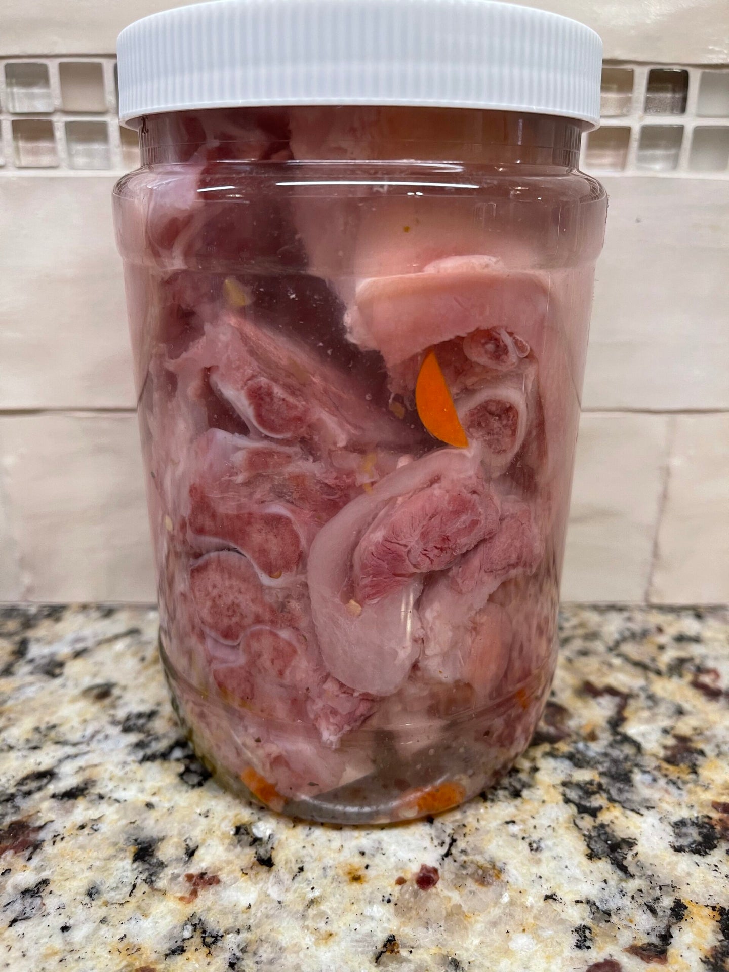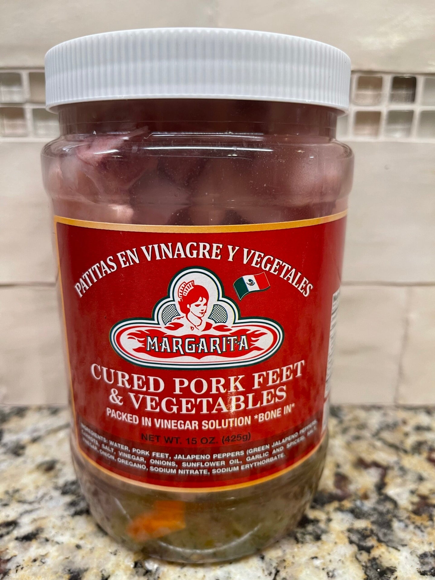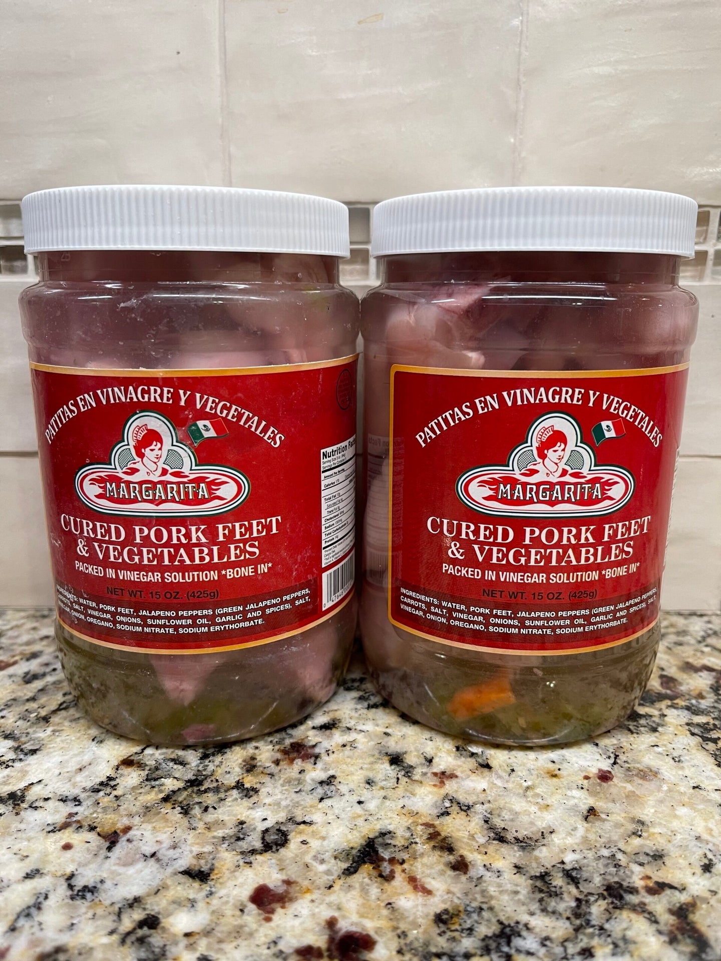 Tasty Quay Corp Maragrita Patitas en Vinagre y Vegetales or Cured Pickled pig’s feet in vinegar and vegetables. These delicious bone in pig feet are second to none. Customers keep coming back because our quality and freshness.