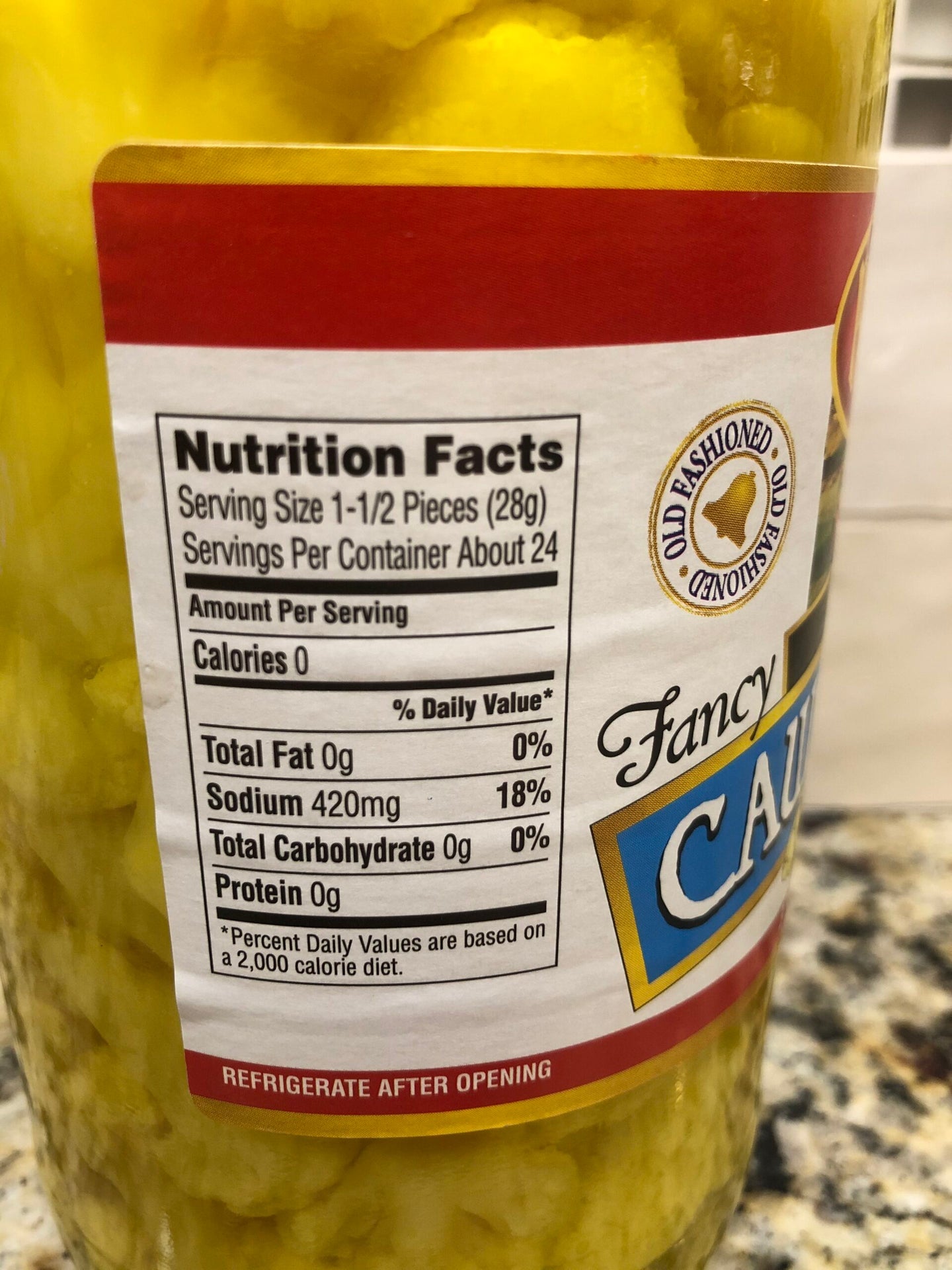 Ingredients: CAULIFLOWER, WATER, SALT, VINEGAR, ALUM, CALCIUM CHLORIDE, NATURAL FLAVORS, FD&C YELLOW NO. 5, FD&C BLUE NO. 1, SODIUM BISULFITE, SODIUM BENZOATE (PRESERVATIVE)