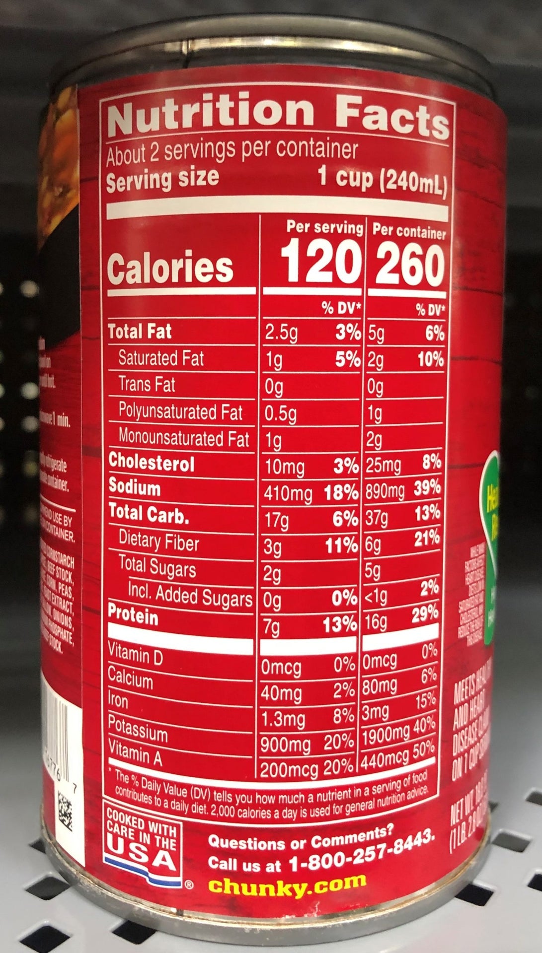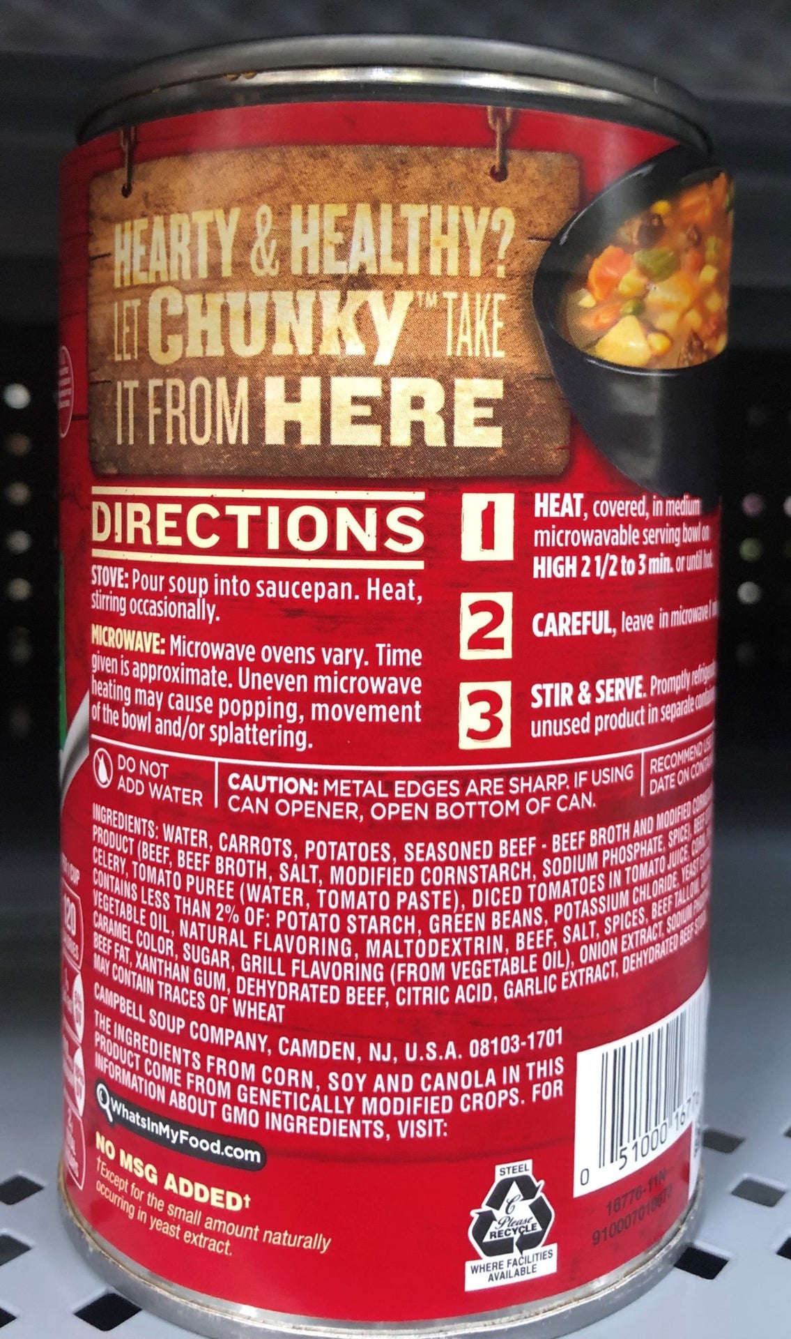 Ingredients: Ingredients: Water, Carrots, Potatoes, Seasoned Beef-Beef Broth And Modified Cornstarch Product (Beef, Beef Broth, Salt, Modified Cornstarch, Sodium Phosphate, Spice), Celery, Tomato Puree (Water, Tomato Paste), Diced Tomatoes In Tomato Juice, Corn, Contains Less Than 2% Of: Potato Starch, Green Beans, Peas, Salt, Yeast Extract, Flavoring, Soy Sauce (Wheat, Soybeans, Salt, Maltodextrin), Spice, Caramel Color, Beef Extract, Beef Tallow, Sesame Seed Oil, Garlic Extract, Glutamic Acid, Xanthan Gum, Soy Lecithin, Onion Extract. Contains: Wheat, Soy.