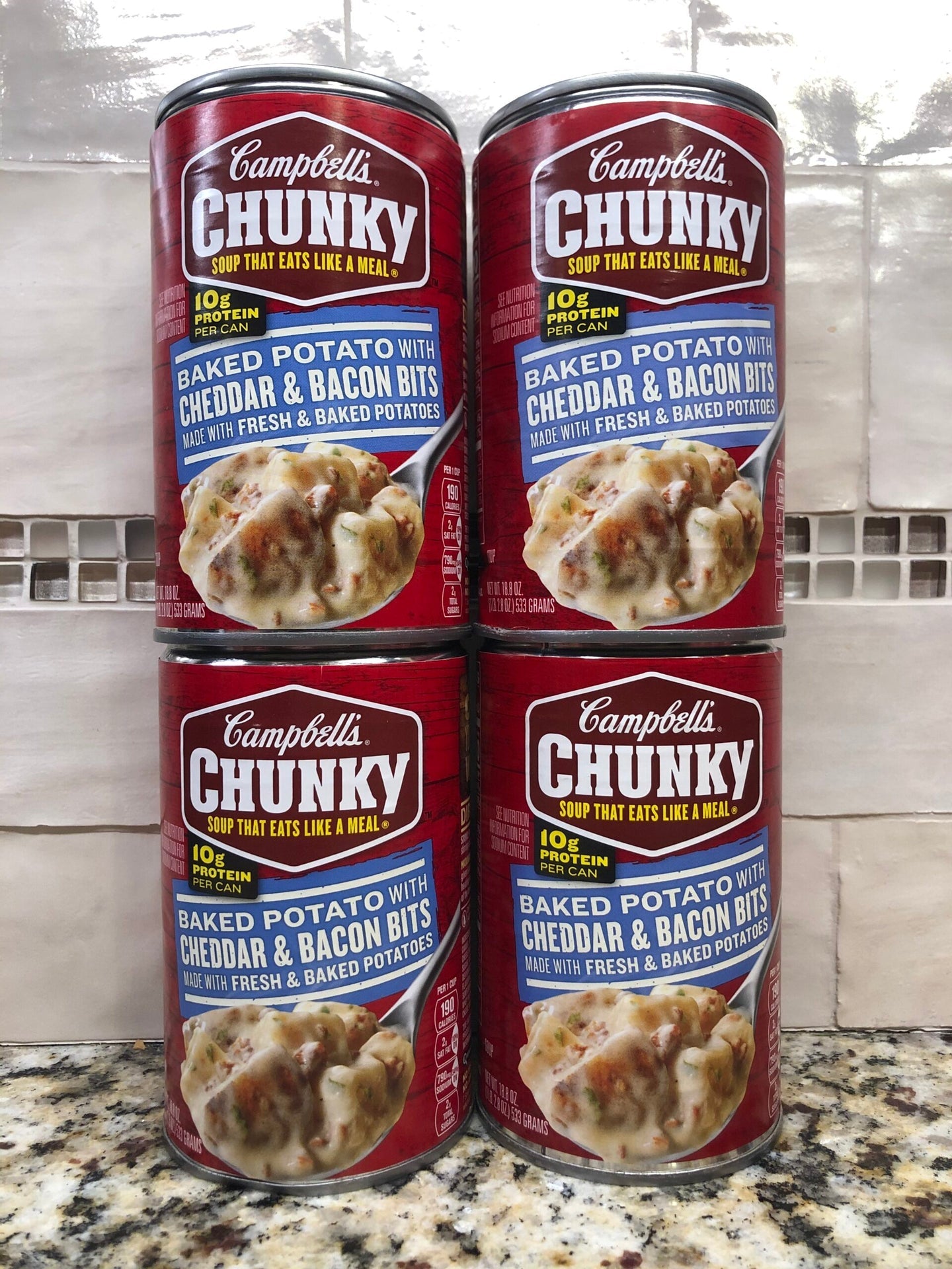 4 Campbell's CHUNKY Baked Potato with Cheddar & Bacon Bits Soup 18.8 oz Cans 4 Campbell's CHUNKY Baked Potato with Cheddar & Bacon Bits Soup 18.8 oz Cans 4 Campbell's CHUNKY Baked Potato with Cheddar & Bacon Bits Soup 18.8 oz Cans 4 Campbell's CHUNKY Baked Potato with Cheddar & Bacon Bits Soup 18.8 oz Cans
