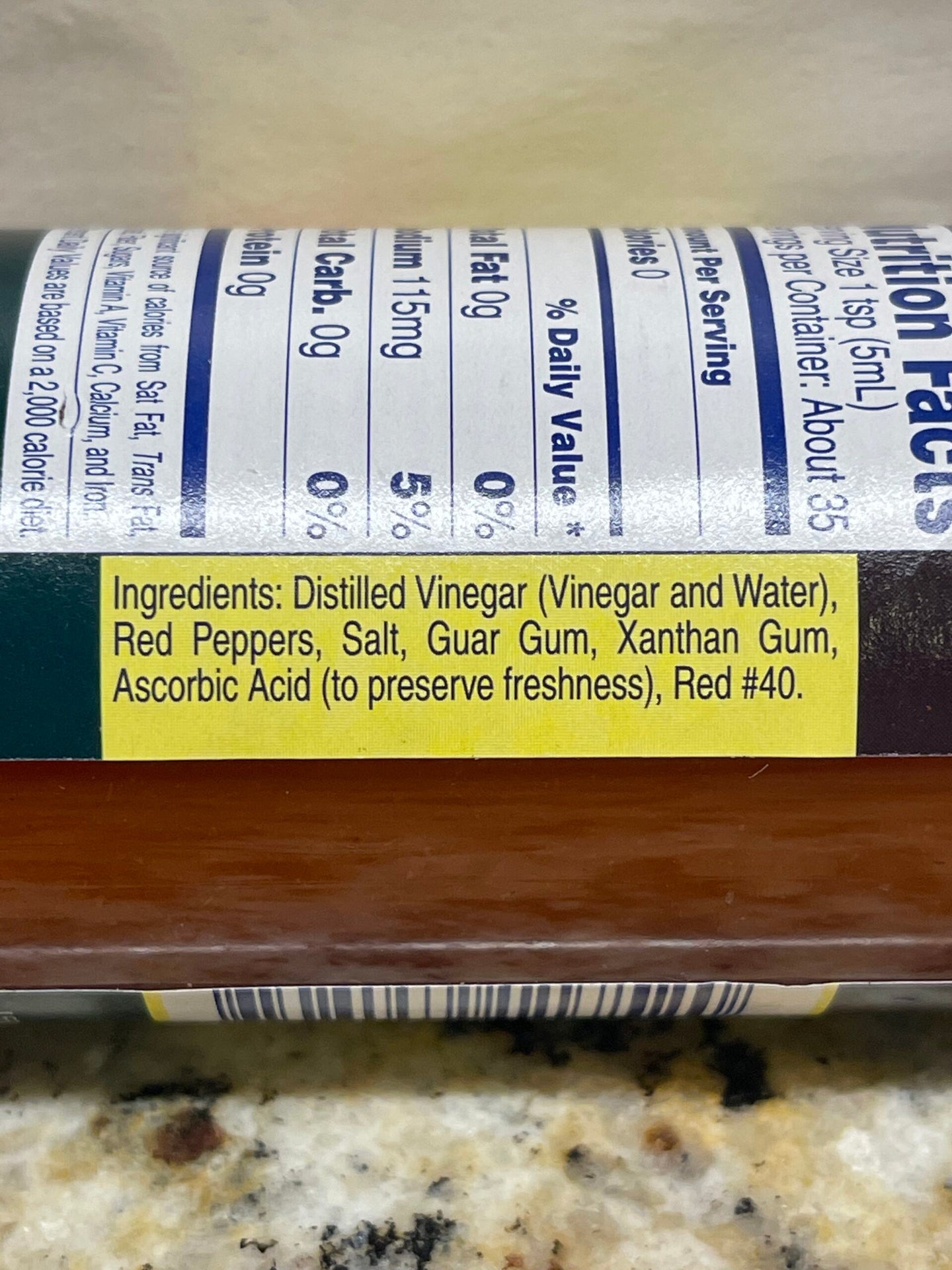 Ingredients: Distilled Vinegar (Distilled Vinegar, Water), Jalapeno Pepper, Salt, Guar Gum, Xanthan Gum, Ascorbic Acid (to Preserve Freshness), Red 40.
