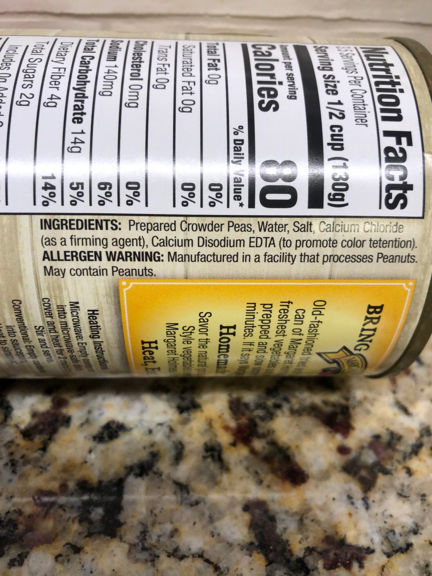 Ingredients: Crowder Peas, Water, Salt And Calcium Disodium Edta (to Promote Color Retention). May Contain Allergens: Wheat (Wheat Gluten), Soybeans (Hydrolyzed Soy Protein) & Peanuts.