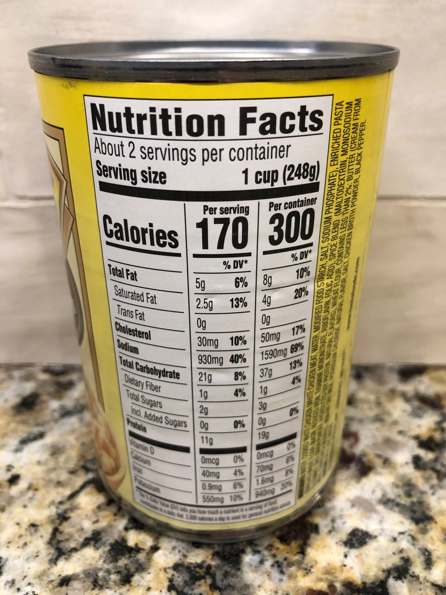 Ingredients: WATER, COOKED WHITE CHICKEN (WHITE CHICKEN MEAT, WATER, MODIFIED FOOD STARCH, SALT, SODIUM PHOSPHATE), ENRICHED PASTA (ENRICHED WHEAT FLOUR, NIACIN, REDUCED IRON, THIAMINE MONONITRATE, RIBOFLAVIN, FOLIC ACID), SPICE BLEND (MALTODEXTRIN, MONOSODIUM GLUTAMATE, SALT, ONION POWDER, HYDROLYZED SOY PROTEIN, NATURAL FLAVORS), WHEAT FLOUR, CONTAINS LESS THAN 2%: BUTTER (CREAM FROM MILK), CORNSTARCH MODIFIED, NON-FAT DRY MILK, POTASSIUM CHLORIDE, NATURAL FLAVOR, SALT, CHICKEN BROTH POWDER, BLACK PEPPER.