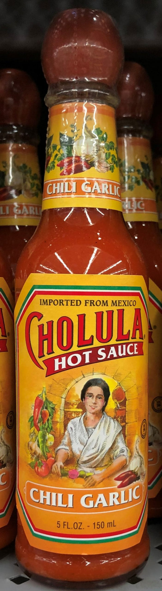 Cholula Hot Sauce Chili Garlic. Cholula?? Chili Garlic Hot Sauce. Imported from Mexico. 5 fl oz - 150ml.