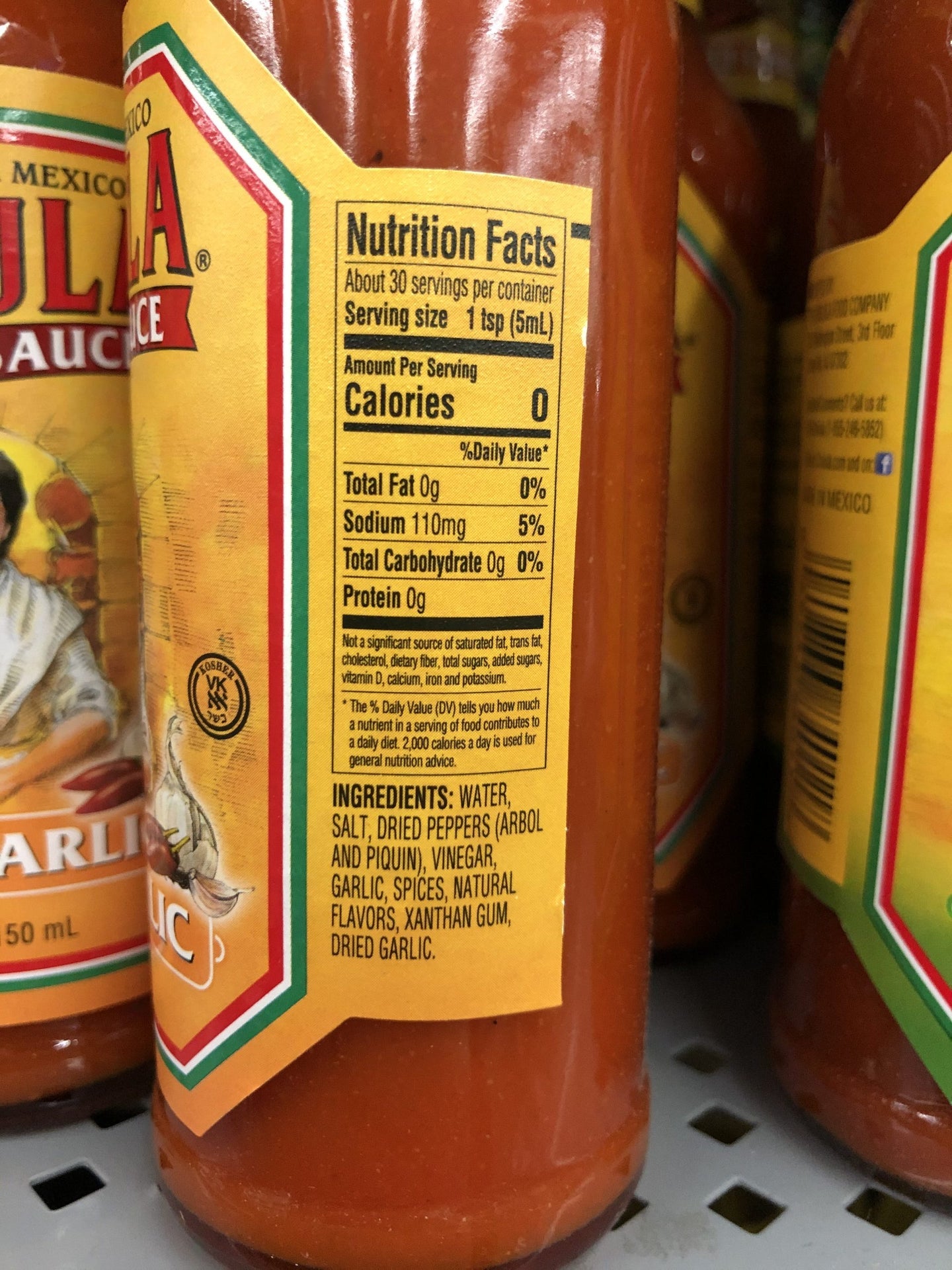 Ingredients: WATER, SALT, DRIED PEPPERS (ARBOL AND PIQUIN), VINEGAR, GARLIC SPICES, NATURAL FLAVORS, XANTHAN GUM, DRIED GARLIC.