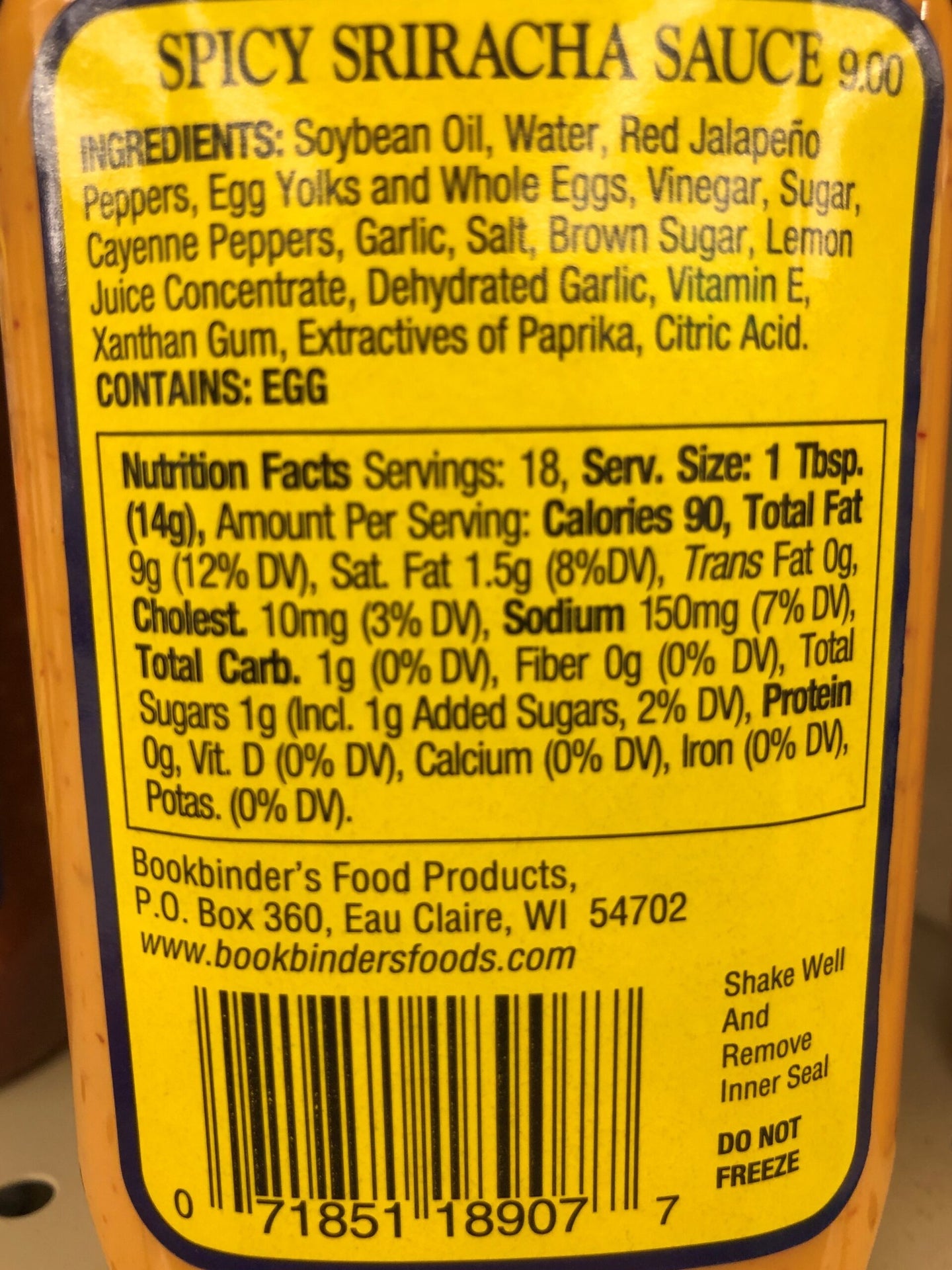 Ingredients: SOYBEAN OIL, DISTILLED VINEGAR, CHILI PEPPER, WHOLE EGG, EGG YOLKS, WATER, SUGAR, SALT, GARLIC, XANTHAN GUM, SPICES, NATURAL FLAVORINGS, VITAMIN E, POTASSIUM SORBATE AND SODIUM BENZOATE (USE AS PRESERVATIVES).