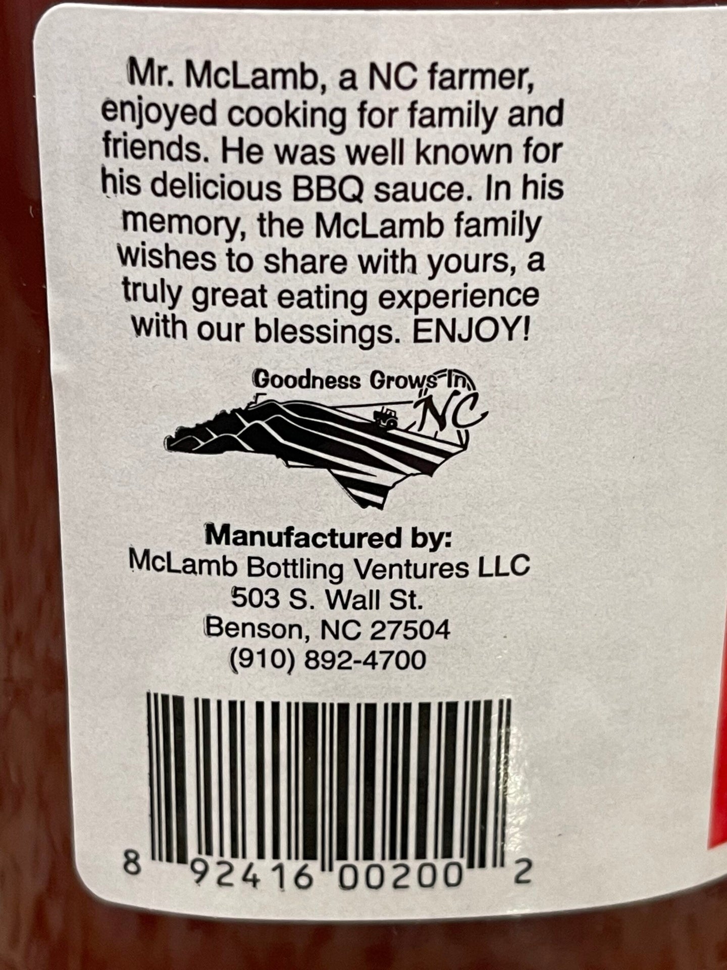 Mr.Mclamb, a NC farmer, enjoyed cooking for family and friends. He was well known for his delicious BBQ sauce. In his memory, the Mclamb family wishes to share with yours, a truly great eating experience with our blessings.