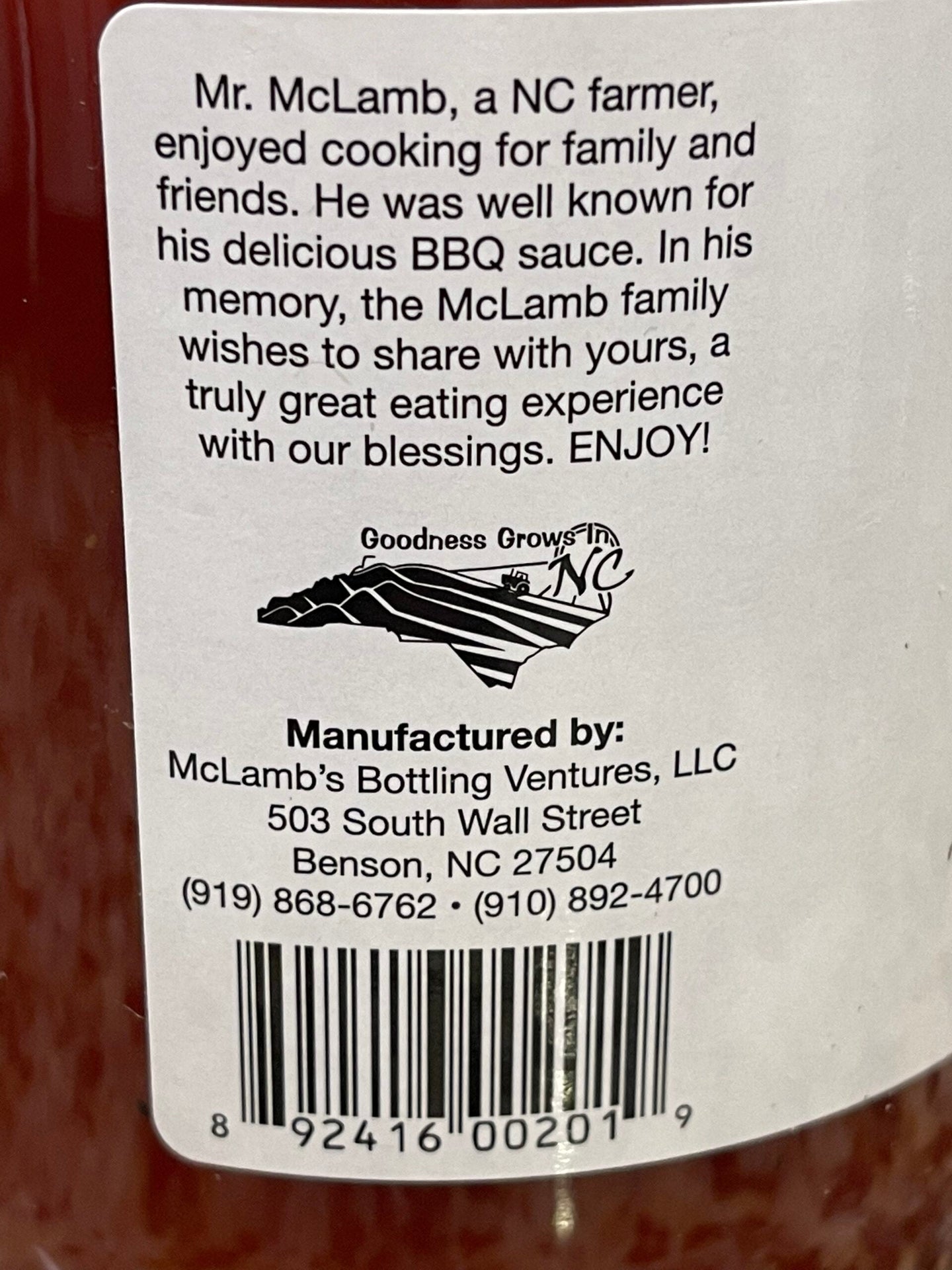 Mr.Mclamb, a NC farmer, enjoyed cooking for family and friends. He was well known for his delicious BBQ sauce. In his memory, the Mclamb family wishes to share with yours, a truly great eating experience with our blessings.This delicious tomato based sauce is perfect on all types of meat. You get a flavor explosion when you add it to your pull pork or ribs. The sauce shines on chicken andbeef brisket. It is just that good. We could eat it on veggies too!