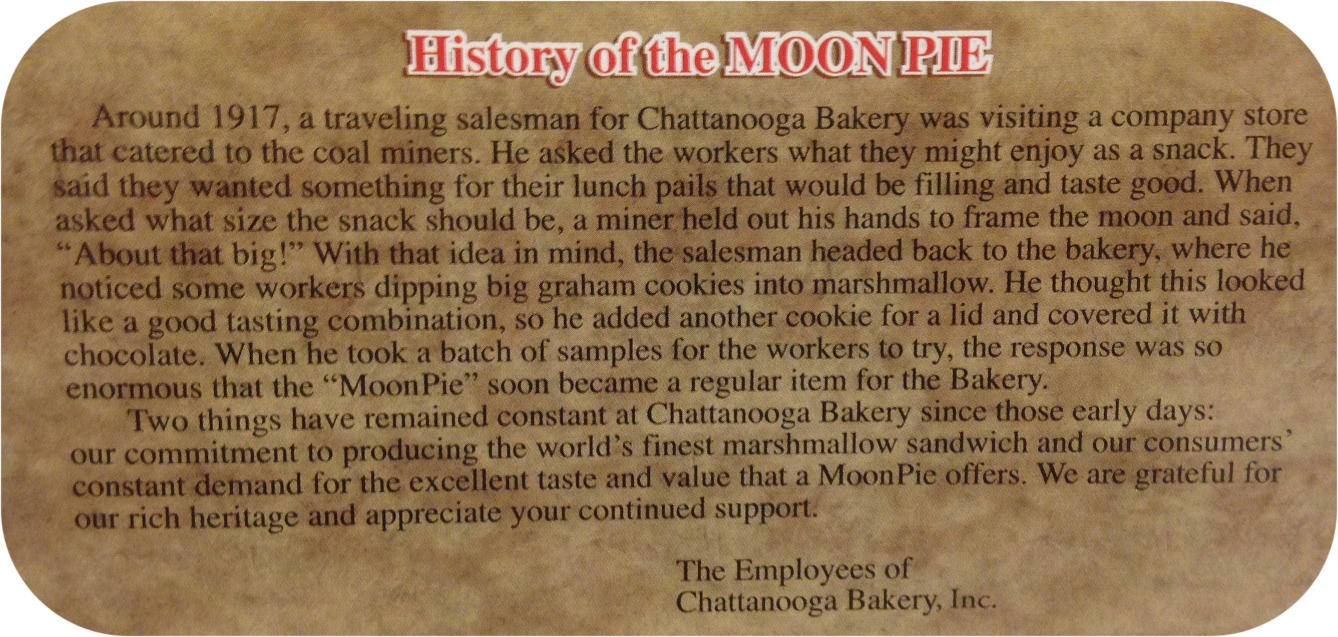 The ORIGINAL MoonPie ... the one who brought us to the dance. It's big enough for your mid-sized appetite, but not so big it'll spoil your next meal. It's great for kids, and for the kid in all of us. "Just Right for Any Appetite"