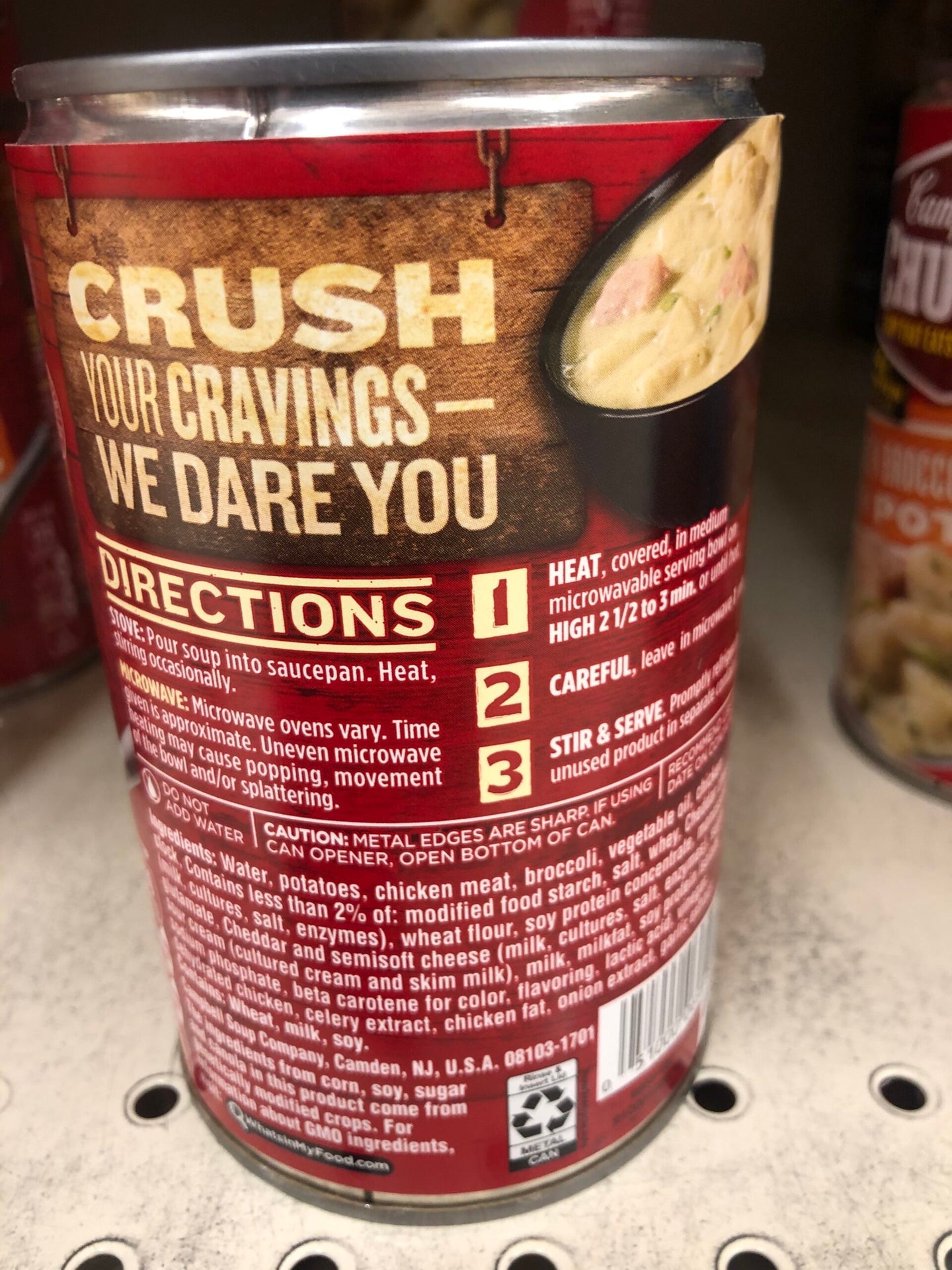 Ingredients: Ingredients: Water, Potatoes, Chicken Meat, Broccoli, Vegetable Oil, Chicken Stock, Contains Less Than 2% Of: Modified Food Starch, Salt, Whey, Cheddar Cheese (Milk, Cultures, Salt, Enzymes), Wheat Flour, Soy Protein Concentrate, Monosodium Glutamate, Cheddar And Semisoft Cheese (Milk, Cultures, Salt, Enzymes), Sugar, Sour Cream (Cultured Cream And Skim Milk), Milk, Milkfat, Soy Protein Isolate, Sodium Phosphate, Beta Carotene For Color, Flavoring, Lactic Acid, Vinegar, Dehydrated Chicken, Celery Extract, Chicken Fat, Onion Extract, Garlic Extract. Contains: Wheat, Milk, Soy.