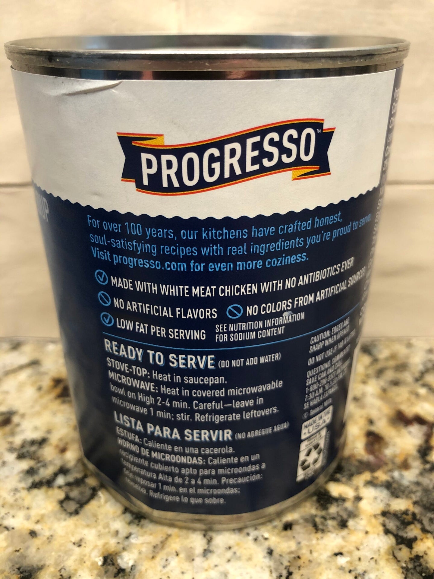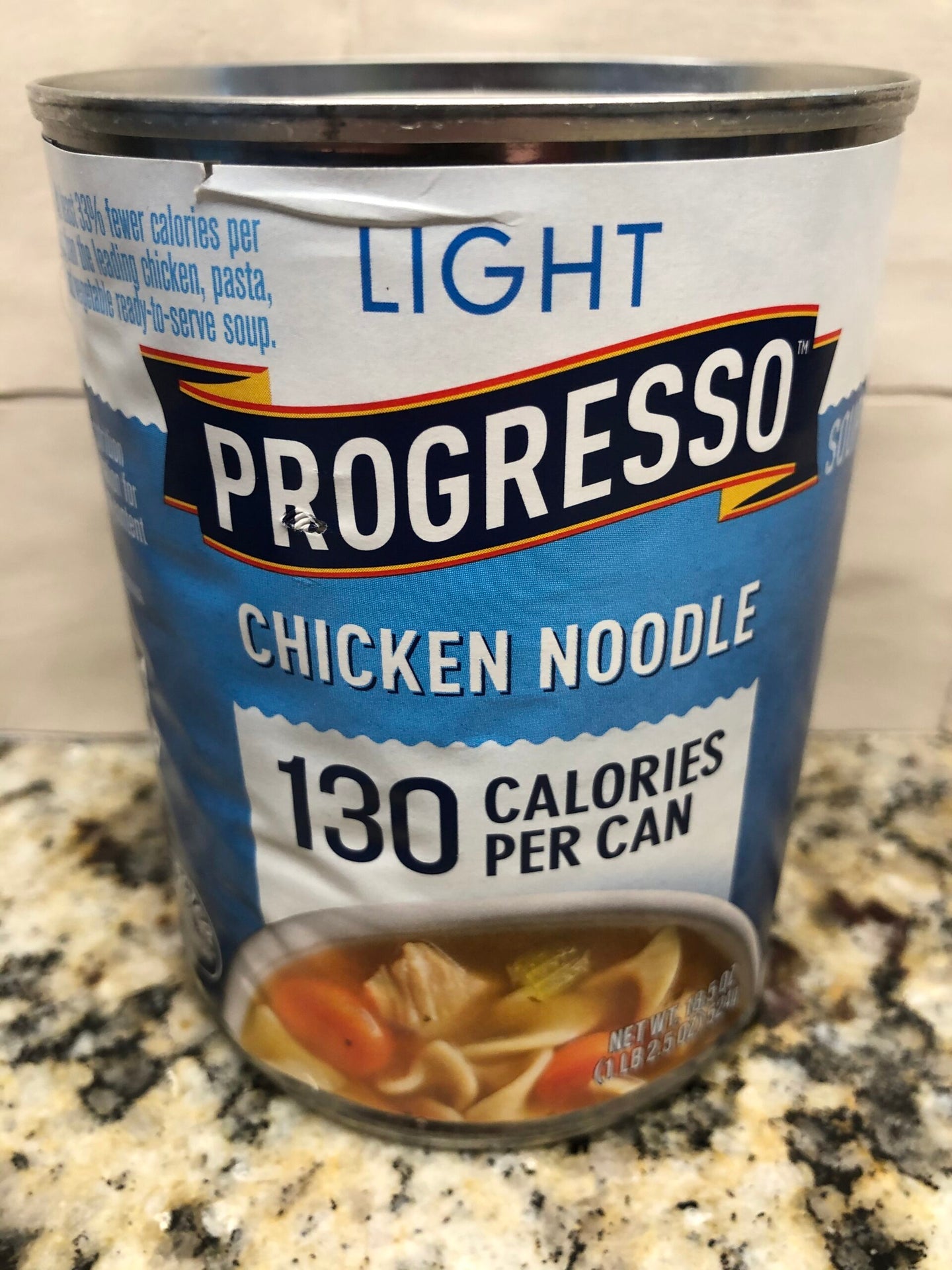 Enjoy the soul-satisfying taste of Progresso Light Chicken Noodle Canned Soup made with all white meat chicken and packed full of flavor. With only 130 calories per can, Progresso's light take on this classic comfort food has 33% fewer calories per serving than the leading chicken, pasta and vegetable ready-to-serve soup. This delicious chicken noodle soup can go from can to bowl in under five minutes, so serve alongside crusty garlic bread or roasted vegetables for a quick and comforting meal. Have a can of chicken noodle soup handy for days when you crave a trusted and easy meal option.