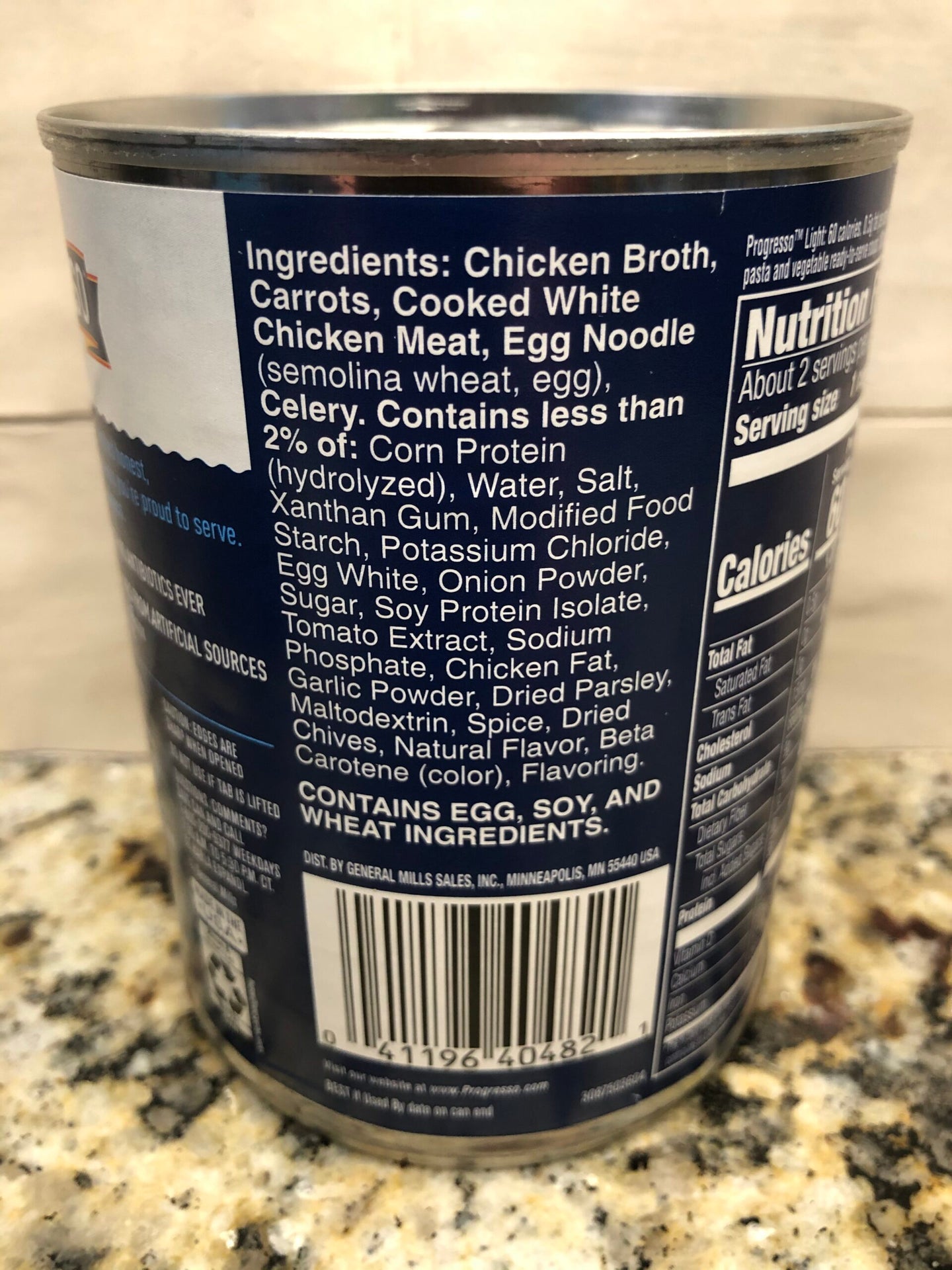 Ingredients: CHICKEN BROTH, CARROTS, COOKED WHITE CHICKEN MEAT, EGG NOODLE (SEMOLINA WHEAT, EGG), CELERY. CONTAINS LESS THAN 2% OF: CORN PROTEIN (HYDROLYZED), WATER, SALT, XANTHAN GUM, MODIFIED FOOD STARCH, POTASSIUM CHLORIDE, EGG WHITE, ONION POWDER, SUGAR, SOY PROTEIN ISOLATE, TOMATO EXTRACT, SODIUM PHOSPHATE, CHICKEN FAT, GARLIC POWDER, DRIED PARSLEY, MALTODEXTRIN, SPICE, DRIED CHIVES, NATURAL FLAVOR, BETA CAROTENE (COLOR), FLAVORING.