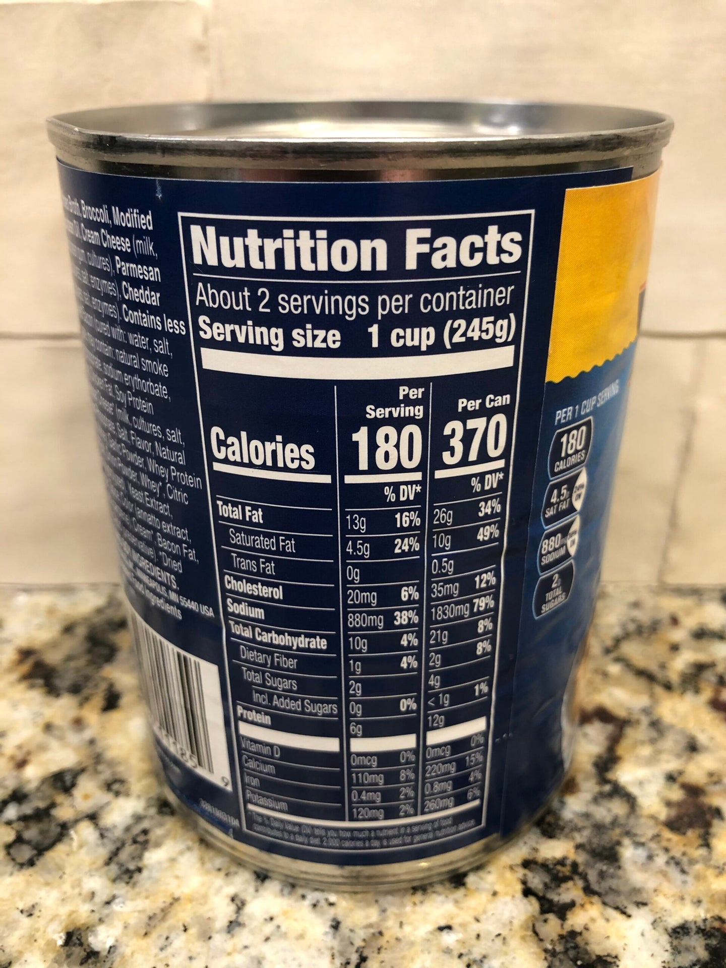 Ingredients: Chicken Broth, Broccoli, Modified Food Starch, Soybean Oil, Cream Cheese (Milk, Cream, Salt, Carob Bean Gum, Cultures), Parmesan Cheese (Milk, Cultures, Salt, Enzymes)*, Cheddar Cheese (Milk, Cultures, Salt, Enzymes), Contains Less than 1% of: Cooked Bacon ( Cured with: Water, Salt, Sugar, Sodium Nitrite, May Contain: Natural Smoke Flavor, Sodium Phosphate, Sodium Erythorbate, Sodium Ascorbate ), Chicken Fat, Soy Protein Concentrate, Cheddar Cheese (Milk, Cultures, Salt, Enzymes)*, Sodium Phosphate, Salt, Natural Flavor, Buttermilk, Whey, Garlic Powder, Whey Protein Concentrate, DATEM, Onion Powder, Whey*, Citric Acid, Corn Gluten (Hydrolyzed), Yeast Extract, Maltodextrin, Sugar, Spice, Color (Annatto Extract, Paprika Extract, Beta Carotene), Cream*, Bacon Fat, Nonfat Milk*, Egg Yolk, Sorbic Acid (Preservative).*Dried.