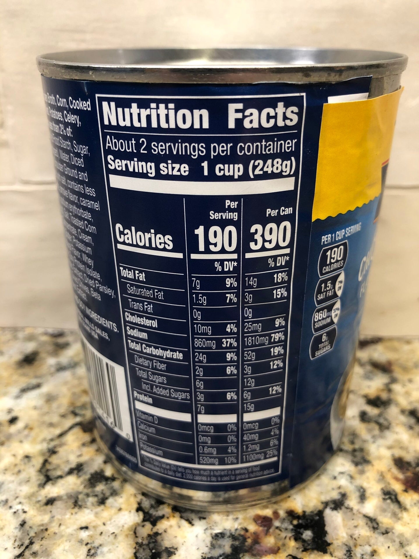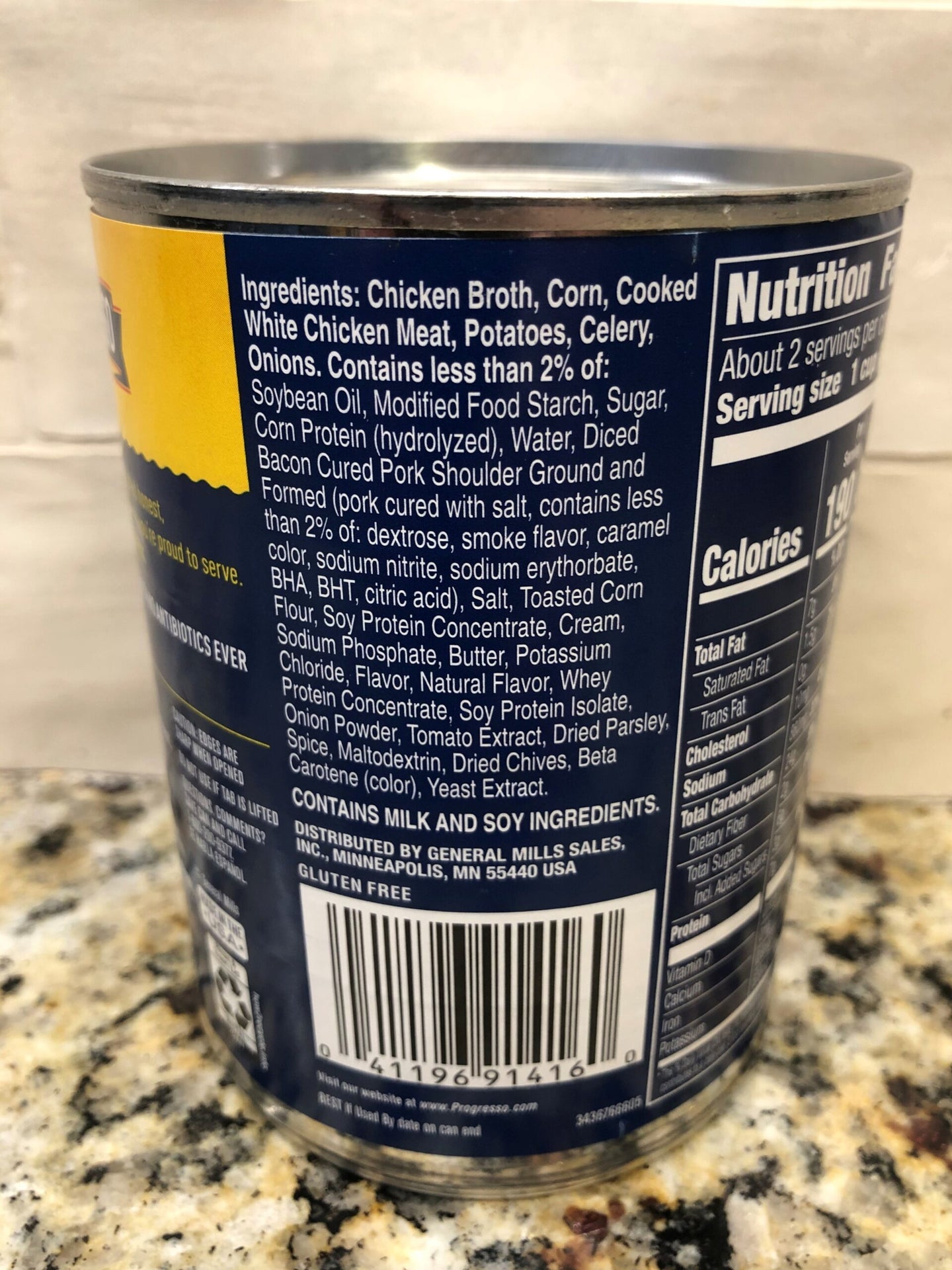 Ingredients: Chicken Broth, Corn, Cooked White Chicken Meat, Potatoes, Celery, Onion, Contains Less than 2% of: Soybean Oil, Modified Food Starch, Sugar, Corn Protein (Hydrolyzed), Water, Diced Bacon Cured Pork Shoulder Ground and Formed (Pork Cured with Salt, Contains Less than 2% of: Dextrose, Smoke Flavor, Caramel Color, Sodium Nitrite, Sodium Erythorbate, BHA, BHT, Citric Acid), Salt, Toasted Corn Flour, Soy Protein Concentrate, Cream, Sodium Phosphate, Butter, Potassium Chloride, Natural Flavor, Whey Protein Concentrate, Soy Protein Isolate, Onion Powder, Tomato Extract, Dried Parsley, Spice, Maltodextrin, Egg Yolk, Dried Chives, Beta Carotene (Color), Garlic Powder, Yeast Extract, Flavoring.