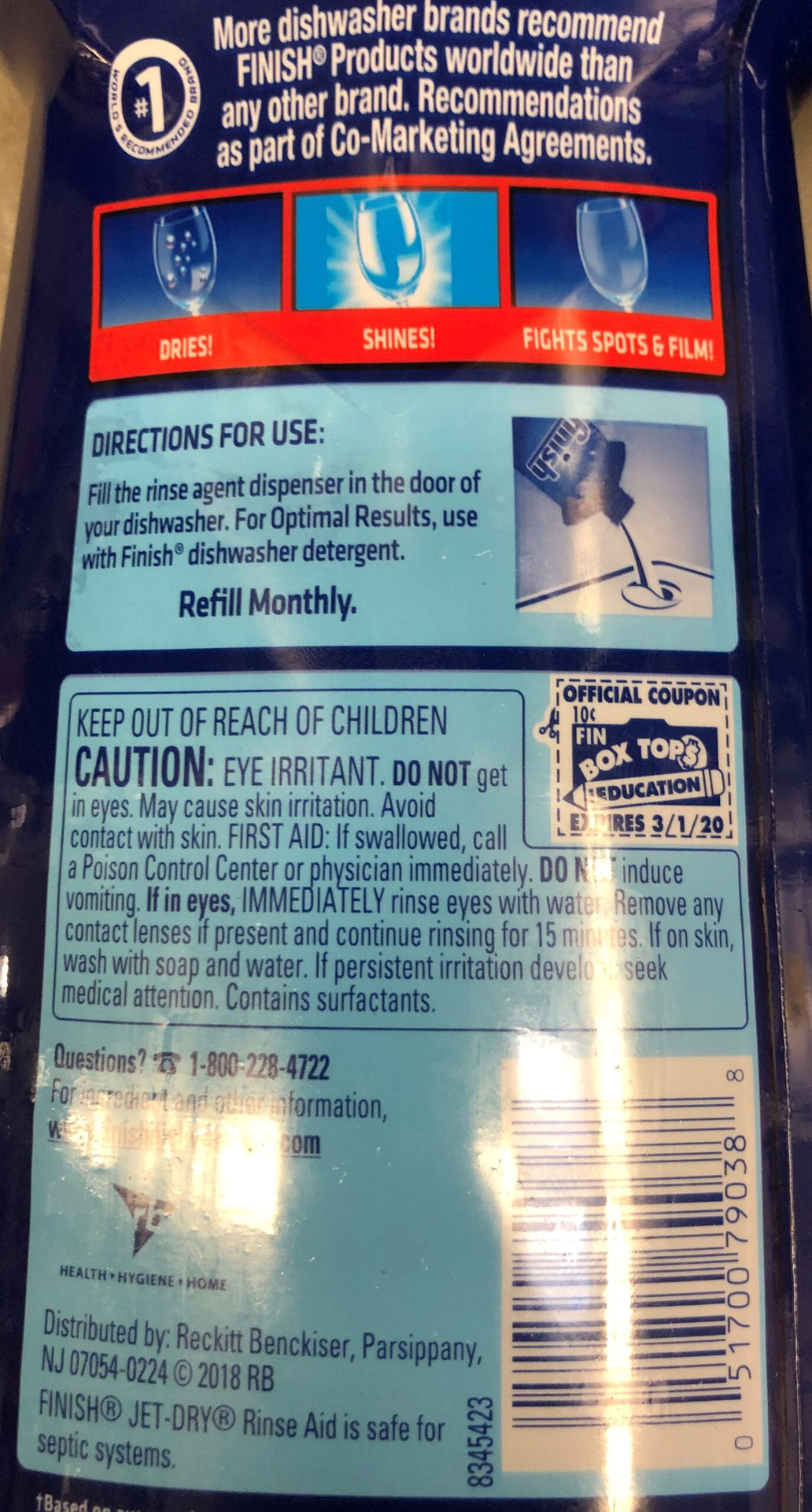 Finish Jet-Dry Rinse Aid has 5x Power Actions and a glass protection ingredient for shinier and drier dishes versus detergent alone. For optimal results, use Finish Jet-Dry Dishwasher Rinse Aid with your detergent and experience shiny dishes and spot and film protection (vs. dishwasher detergent alone). It works with your dishwashing detergent to rinse away stubborn leftover food, spots and film for sparkling dishes, glasses and utensils. It's easy to use as well! Simply fill your rinse aid dispenser with Finish Jet-Dry Rinse Aid and it will be automatically released in the rinse cycle every time your dishwasher runs.