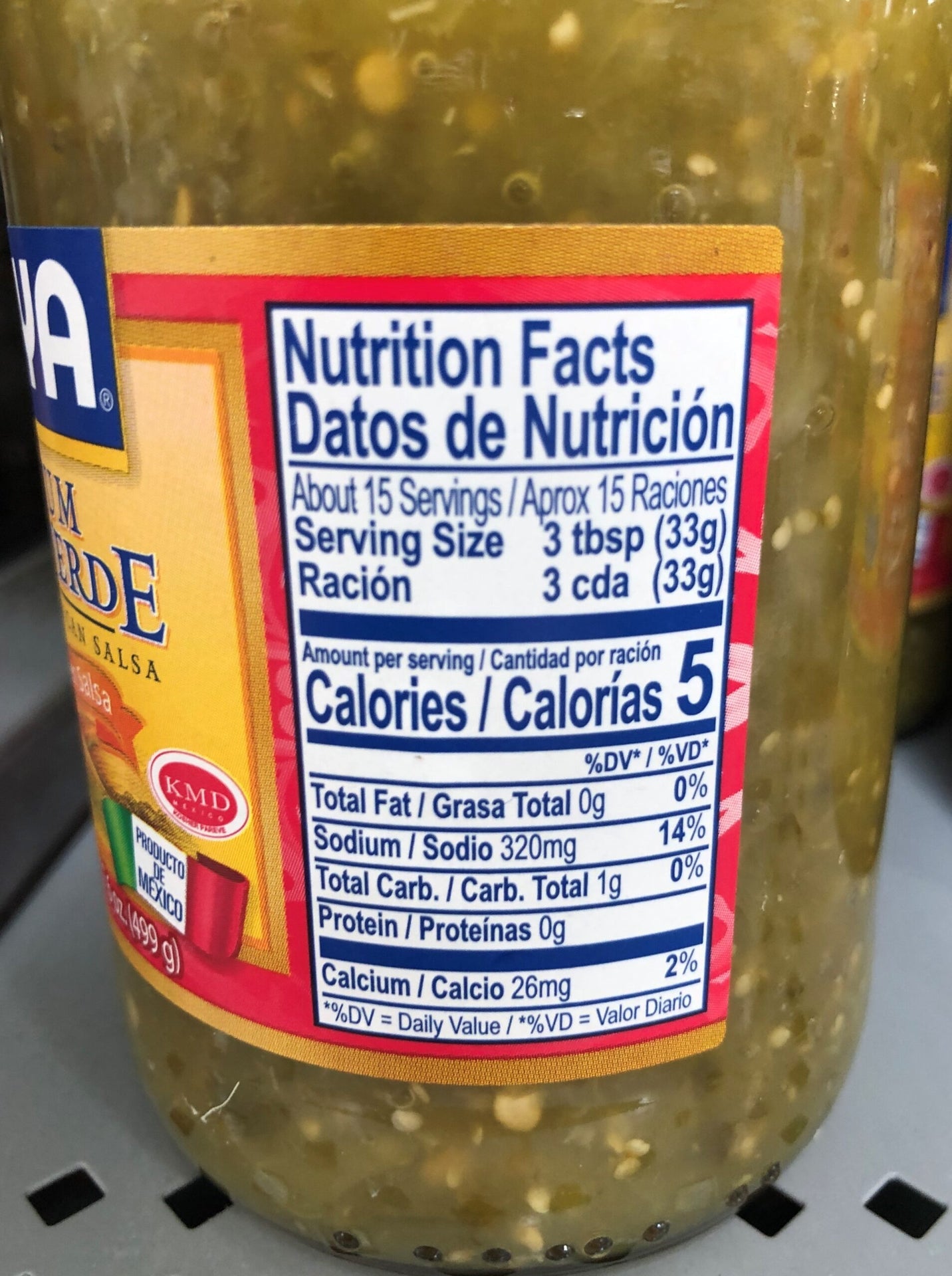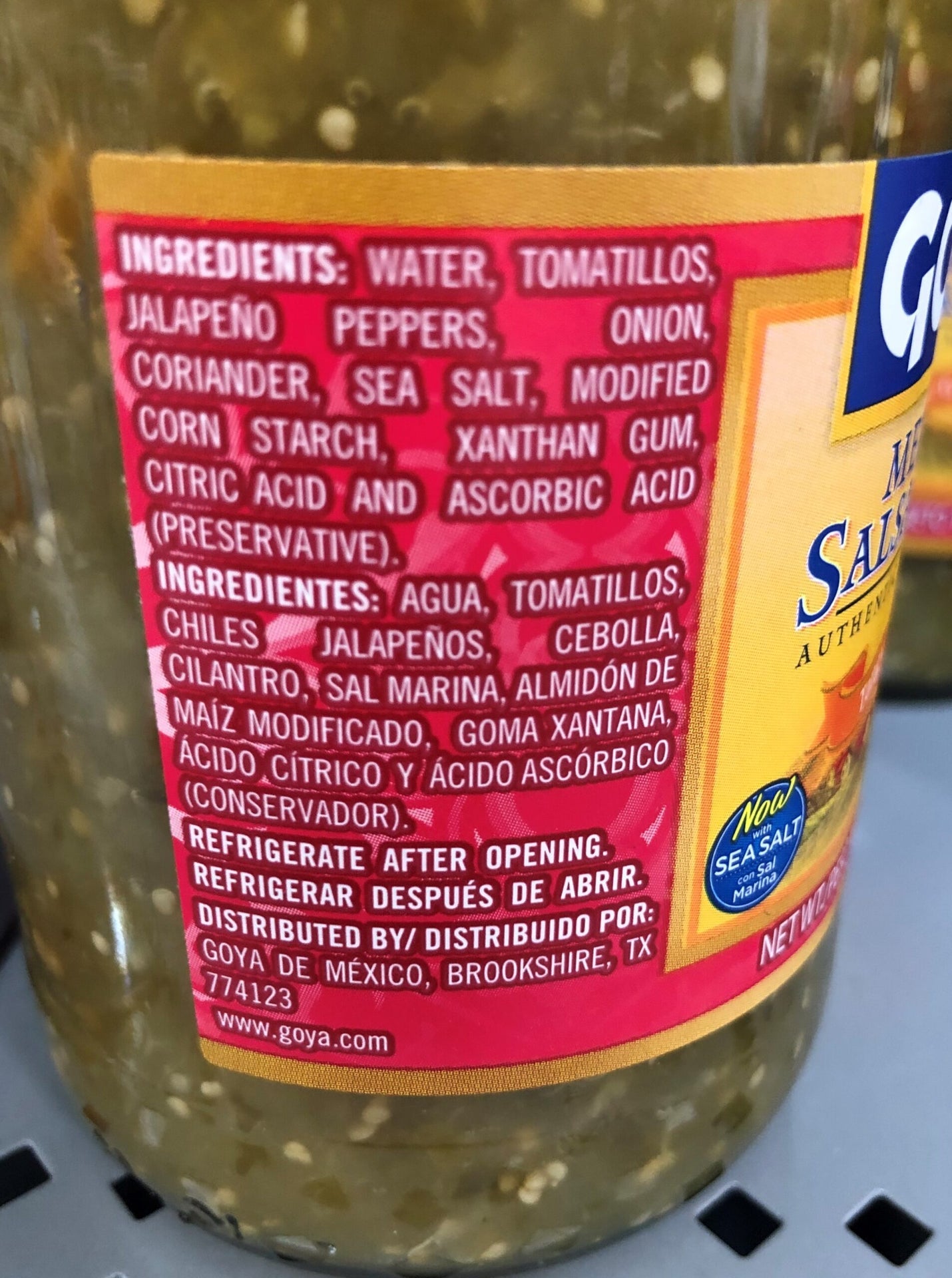 Ingredients: Tomatillo, Jalapeno Peppers, Water, Onion, Iodized Salt, Coriander, Xanthan Gum, Food Starch Modified, Citric Acid, Sodium Benzoate As A Preservative.