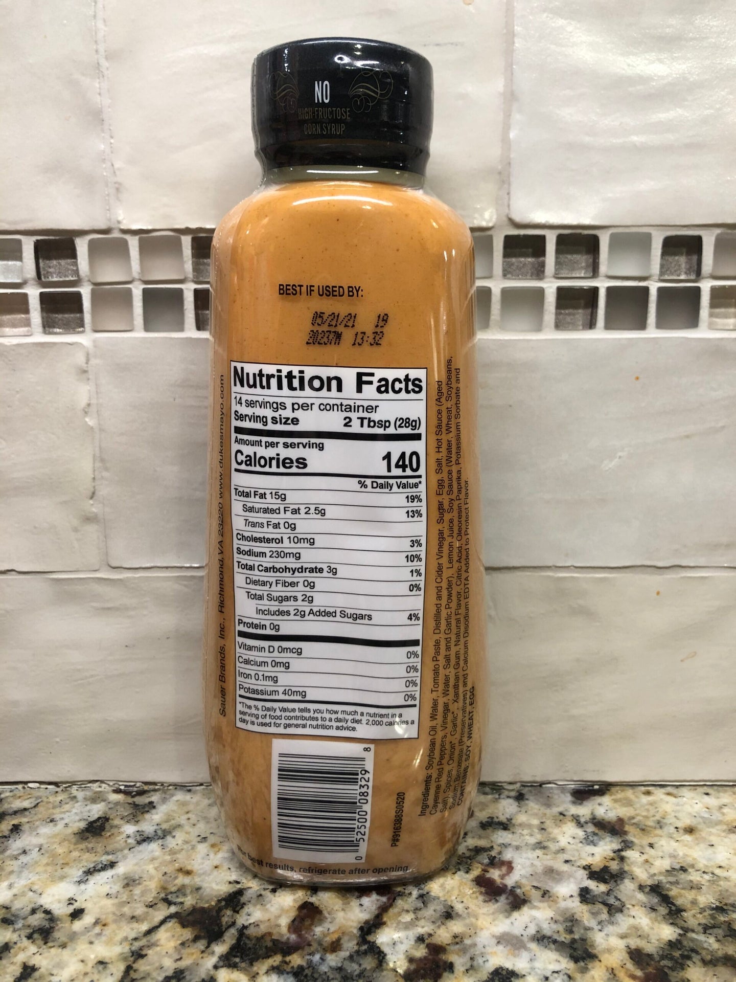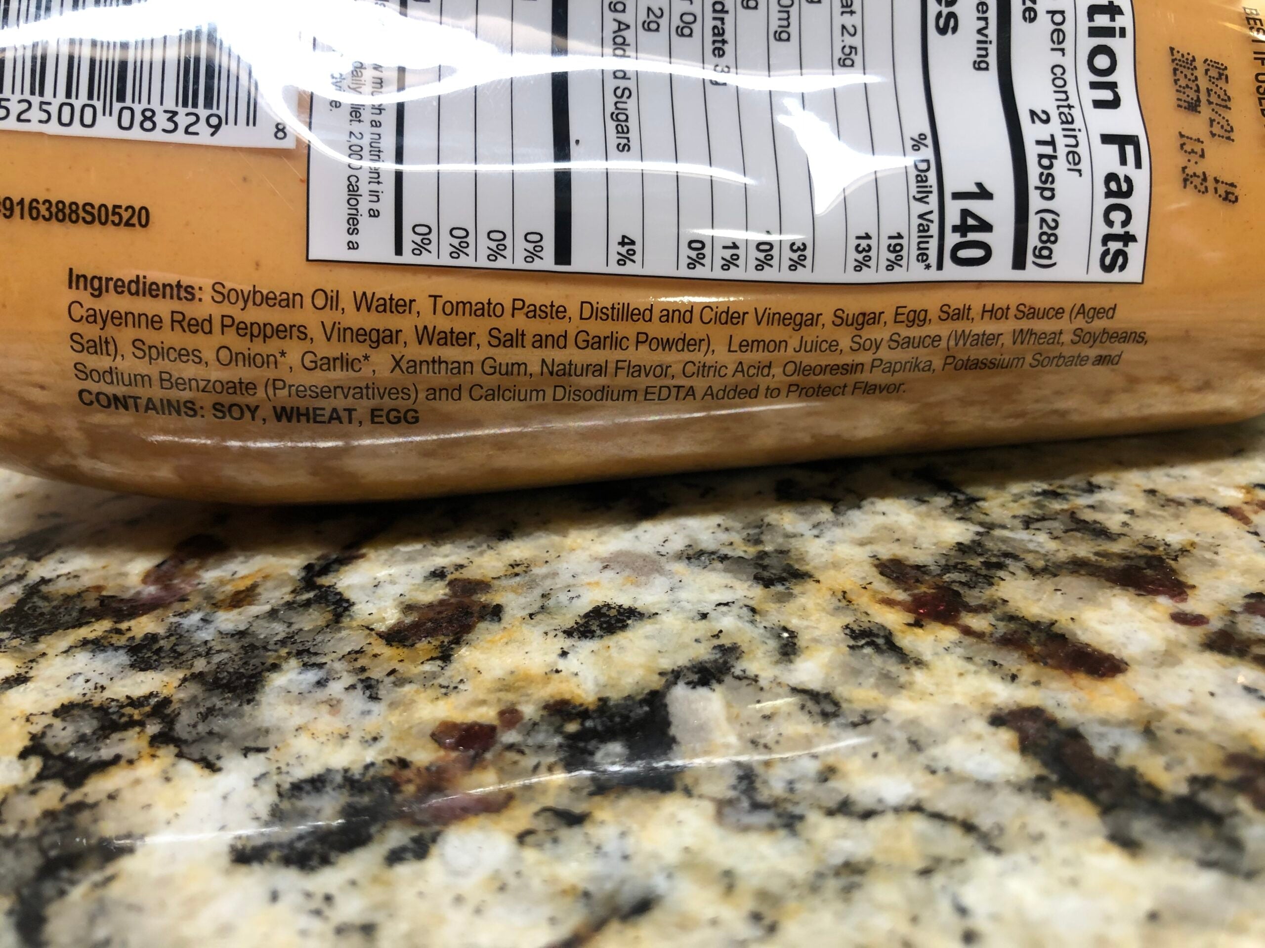 Ingredients : Soybean Oil, Water, Tomato Paste, Distilled and Cider Vinegar, Sugar, Egg, Salt, Hot Sauce (Aged Cayenne Red Peppers, Vinegar, Water, Salt and Garlic Powder), Lemon Juice, Soy Sauce (Water, Wheat, Soybeans, Salt), Spices, Onion*, Garlic*, Xanthan Gum, Natural Flavor, Citric Acid, Oleoresin Paprika, Potassium Sorbate and Sodium Benzoate (Preservatives) and Calcium Disodium EDTA Added to Protect Flavor. *Dehydrated. Contains Soy, Wheat, Egg.