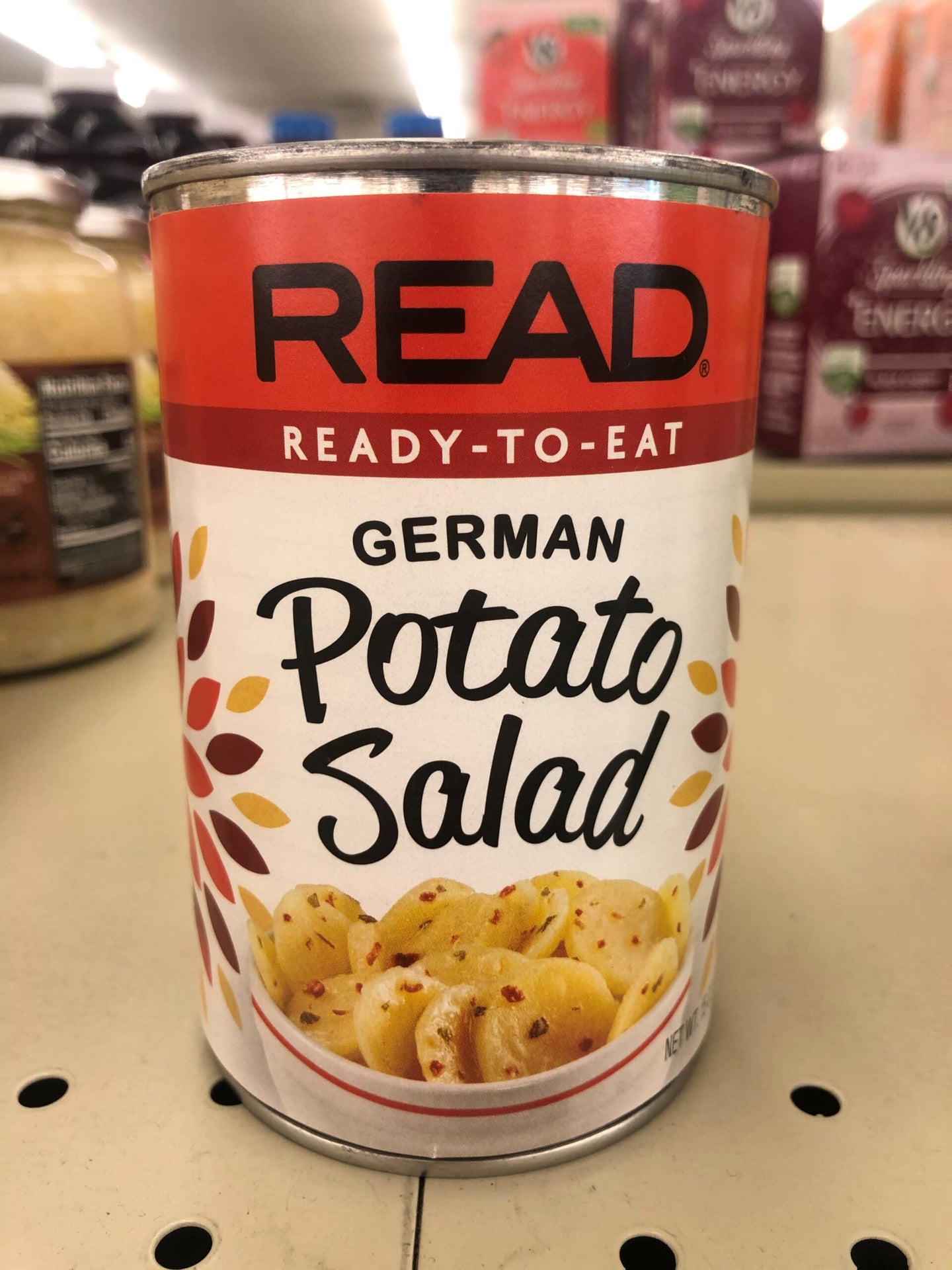 Easily create a tasty meal or snack with Read German Potato Salad, 15 oz. It can make a delicious side dish for a picnic or dinner. You can eat the Read potato salad straight from the can or heat it up before serving. Eat it alone or prepare it with bratwurst, onions and other sides. There are just 120 calories per serving, which makes it easy to factor into your diet plan. The canned German potato salad is seasoned with spices to give it a rich flavor. It takes just a few minutes to heat it up.