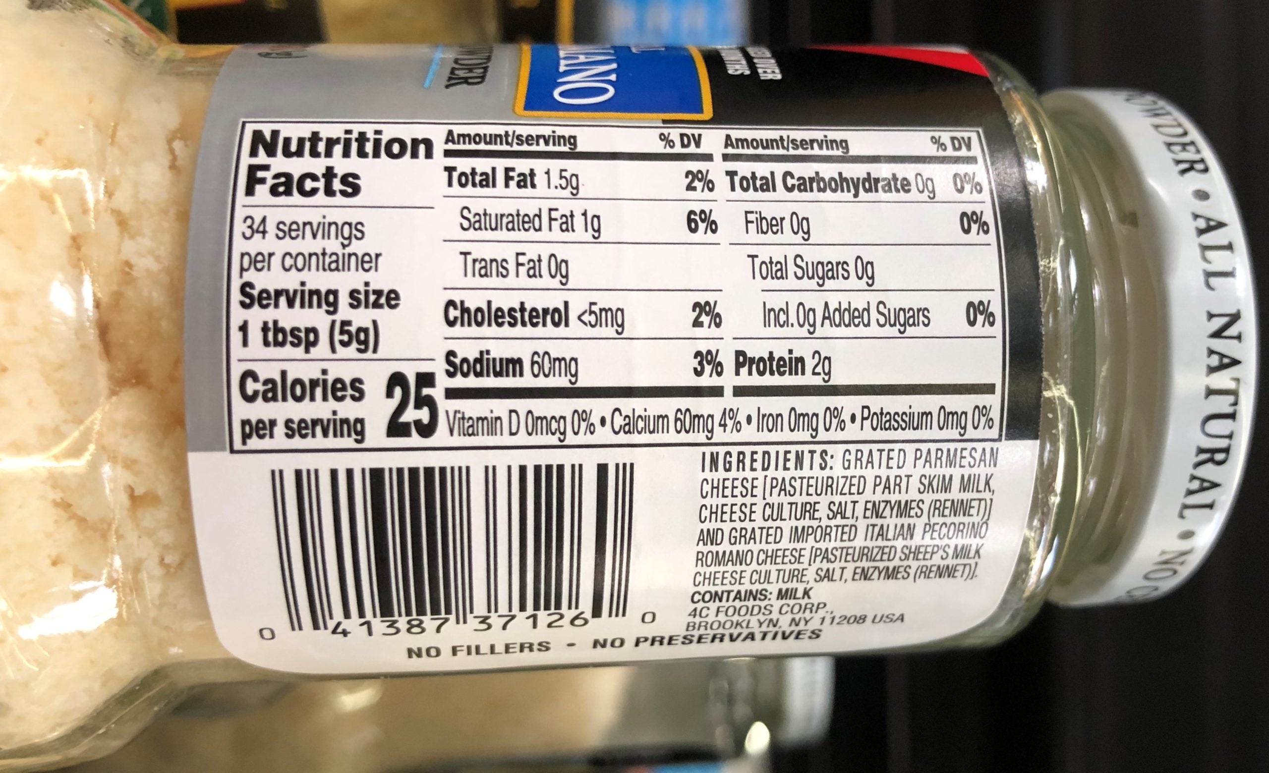 Ingredients: Grated Parmesan Cheese [Pasteurized Part Skim Milk, Cheese Culture, Salt, Enzymes (Rennet)] and Grated Imported Italian Pecorino Romano Cheese [Pasteurized Sheep's Milk, Cheese Culture, Salt, Enzymes (Rennet)].