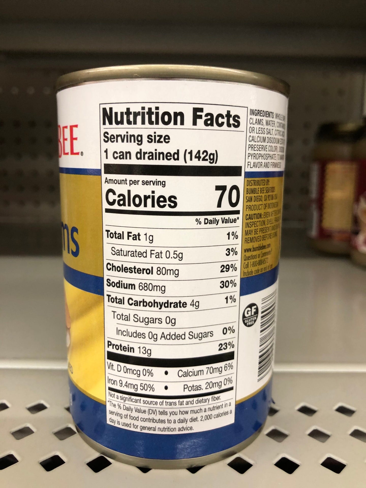 Ingredients: Whole baby clams, water, salt, citric acid, calcium disodium EDTA (to preserve color)