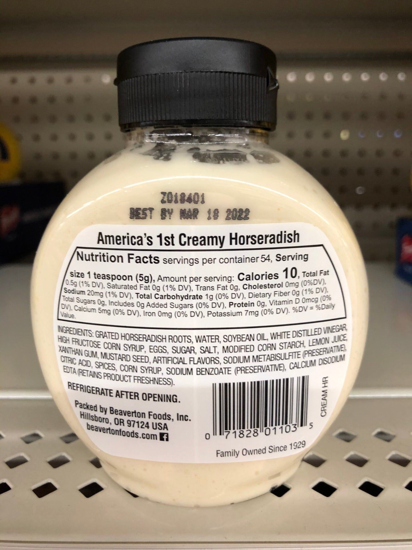 Ingredients: Grated Horseradish Roots, Water, Soybean Oil, White Distilled Vinegar, High Fructose Corn Syrup, Eggs, Sugar, Modified Corn Starch, Salt, Lemon Juice, Xanthan Gum, Sodium Metabisulfite and Sodium Benzoate (Preservatives), Artificial Flavor, Citric Acid, Spices, Calcium Disodium EDTA (Retains Product Freshness), Paprika.