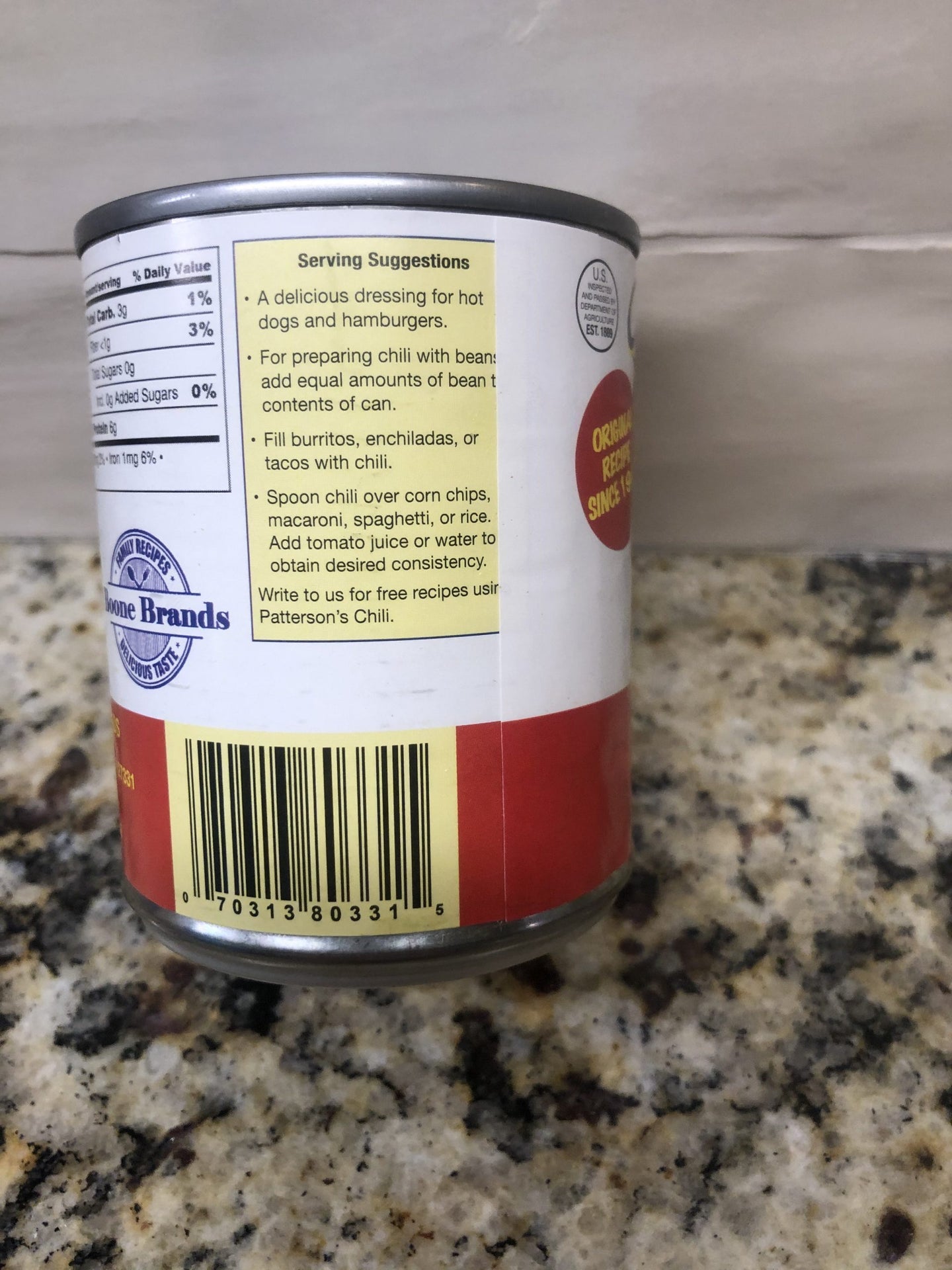 Simply, the best canned chili out there. Patterson’s Hot Dog Chili continues to use the same recipe today that was developed by the Patterson family in 1942. A delicious dressing for hot dogs and hamburgers. Use as a dip ingredient, or with enchiladas and tacos. Made in the USA with 100% pure beef and no fillers. Patterson’s Hot Dog Chili is a Boone Brands product made in Sanford, NC.